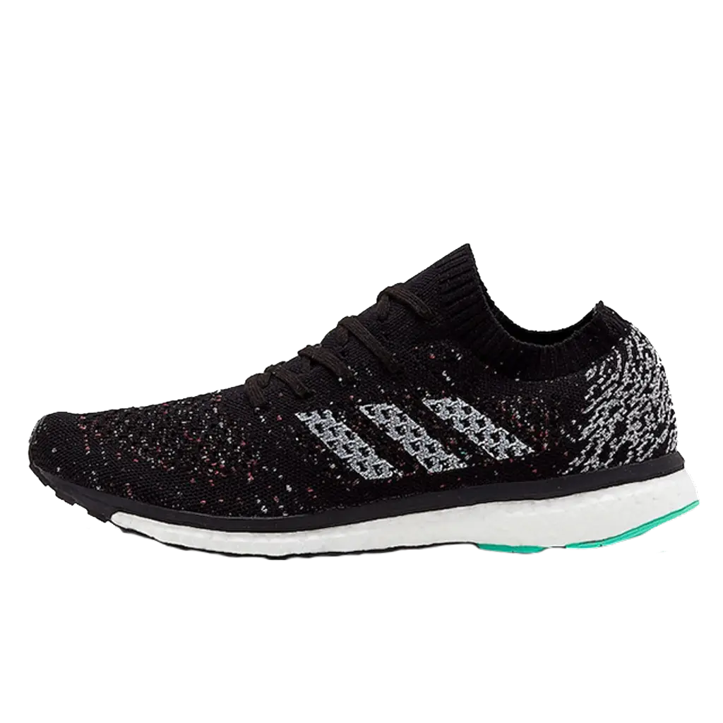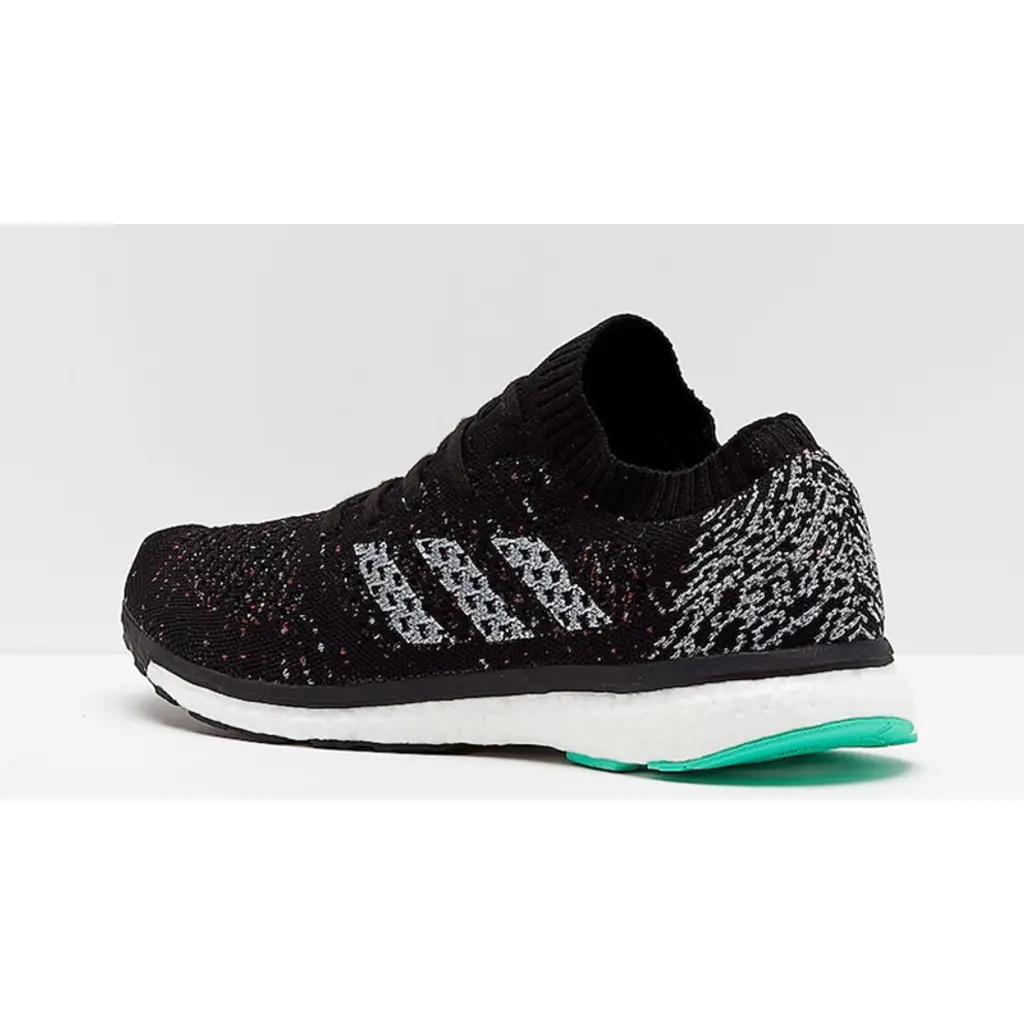 That stretchy material delivers foot-hugging support that keeps you firmly locked in place. On this colourway, a deep shade of black covers much of the upper, contrasted by fiery speckled hits throughout. Contrasting three stripes feature in white to the sidewall and a white Boost unit manages to balance the look underfoot.