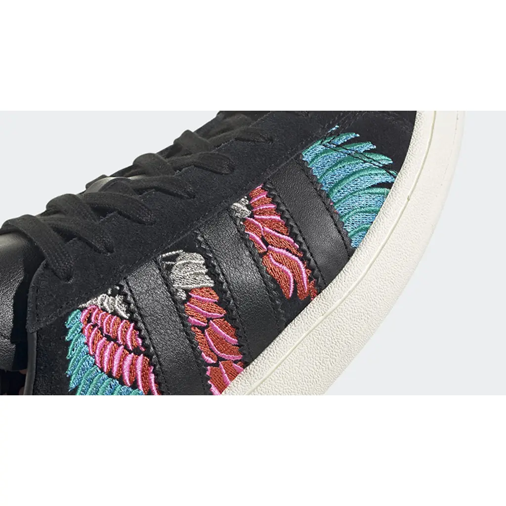 This low-cut Campus 00s has an all-premium suede upper in Core Black. The exceptions are the smooth leather Three Stripes and the heel tabs, also all in Core Black. What will draw your eye on this shoe is the tribute to the stunning feathered costumes from the carnival, a colourful embroidered wing design on the lateral side of the shoe in vibrant shades of blue, red, pink and white. White adidas Trefoil branding stands out on the black heel tab. However, no other branding can be seen except for adidas text branding in white on the bright red-orange insole. A yellowed-out midsole and herringbone-patterned rubber outsole complete the look of this celebratory sneaker.