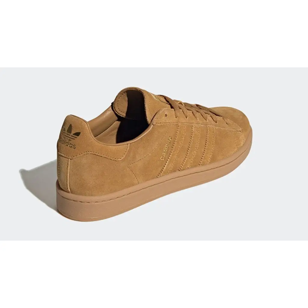 adidas’ sleek 39-year-old on-court trainer, the Campus 80s, has an attractive autumn-appropriate new drop with tan and terracotta hues. Presenting the adidas Campus 80s FI Mesa Gold Metallic. This Campus 80s shoe has an FI Mesa tan premium suede upper from heel to toe. The laces are a slightly darker version of the upper. Gilded adidas Trefoil branding on the tongue, the heel tab and black insole as well as golden CAMPUS branding stamped on the lateral collar give the shoe a luxurious touch. The sole unit has a complementary reddish clay colour, finishing off the style of this shoe.