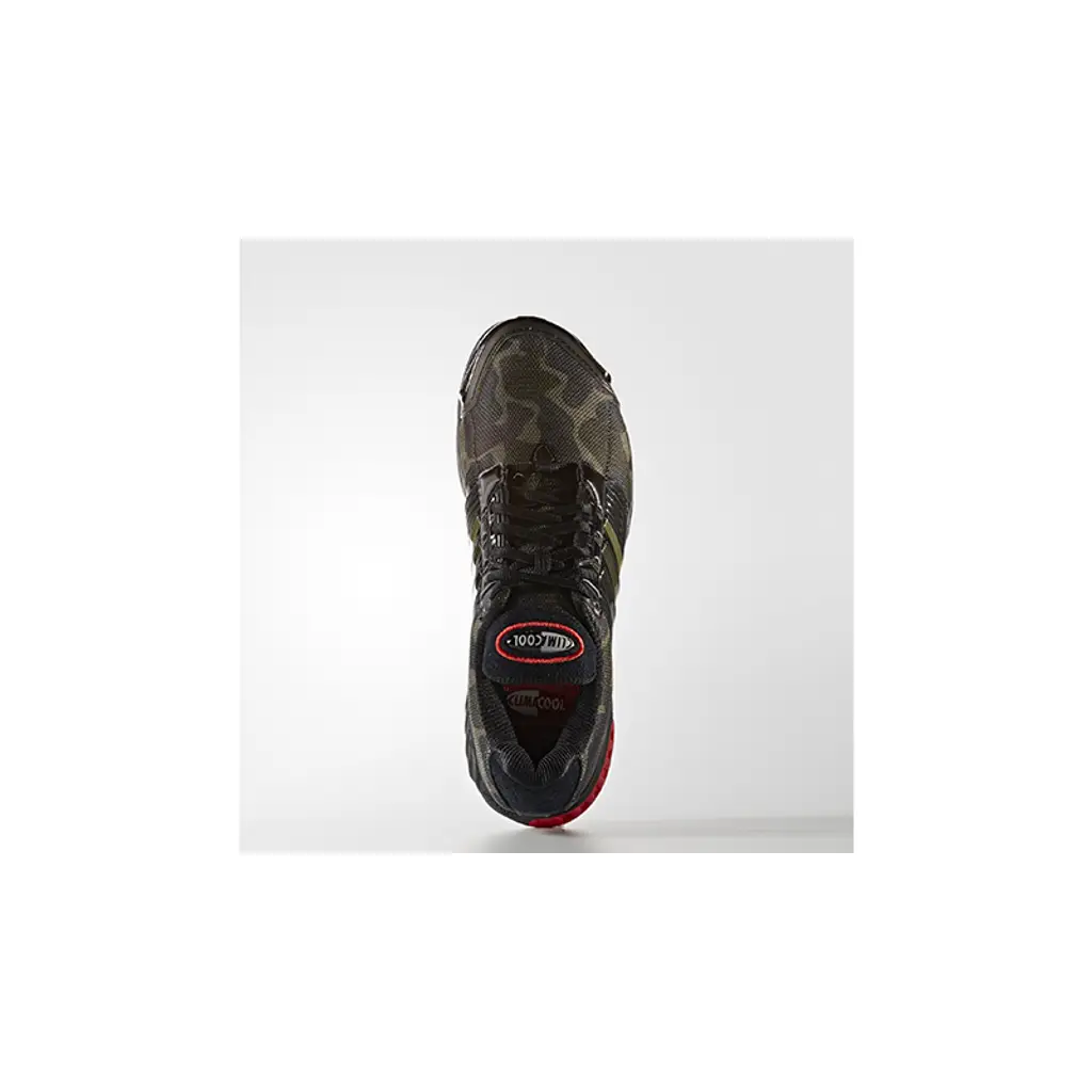 To compliment that camo print upper, a black midsole sits underfoot and vibrant hits of red feature to the heel as well as the tongue. Finally, the ‘Climacool’ logo comes emblazoned throughout.