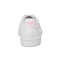 2 tones of pink travel down the sidewalls on thin stripes, an iconic, recognisable feature of the adidas Continental 80. The same light pink has also been used for the adidas and Trefoil branding parallel to the lace unit, as well as on the tongue and heel of the silhouette.