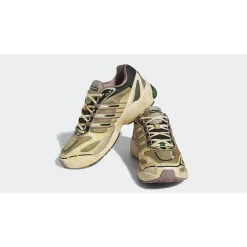 This COS Supernova has an “Aluminium/ Wonder White/ Craft Ochre” colour arrangement. The mesh base has a Craft Ochre colour with Wonder White synthetic overlays that have been hand-dyed with Craft Ochre. The Three Stripes on both the medial and lateral mid-panels have mauve outlines. The main Stripes are Wonder White and Core Black with a gradient treatment and Craft Ochre stains. Black accents appear on the toe box, the eye stay panel and the collar. Mauve repeats on the mesh sock liner. The stained Wonder White EVA midsole is equipped with FORMOTION technology and accented by a vibrant green Adiprene heel accent. A mauve, teal green and black rubber outsole complete the design of this sneaker.