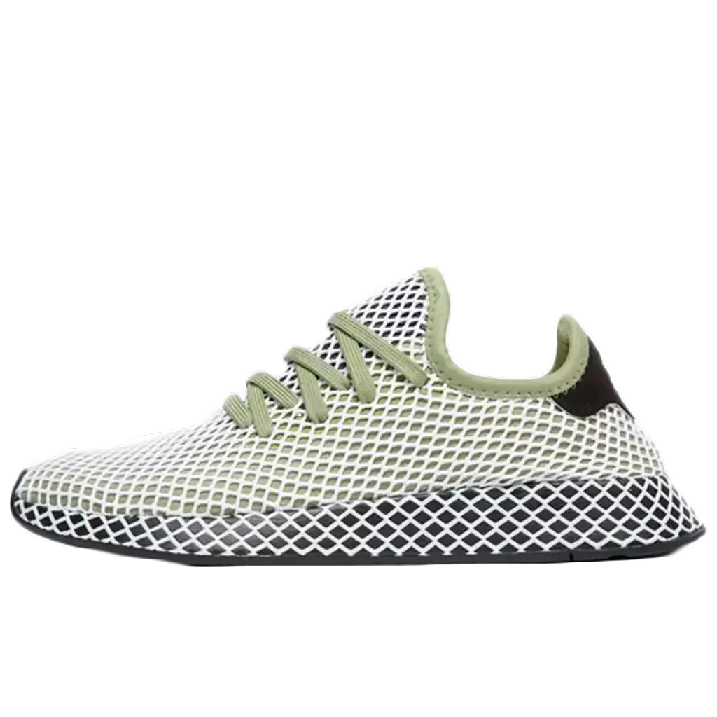 That mesh material gives an almost 3D effect to the adidas Deerupt JD Exclusive. Featuring in white, it also manages to balance that khaki coloured upper. To complete the look, a black midsole features underfoot and adidas Originals branding is stamped throughout. Finally, a set of matching green laces are included.