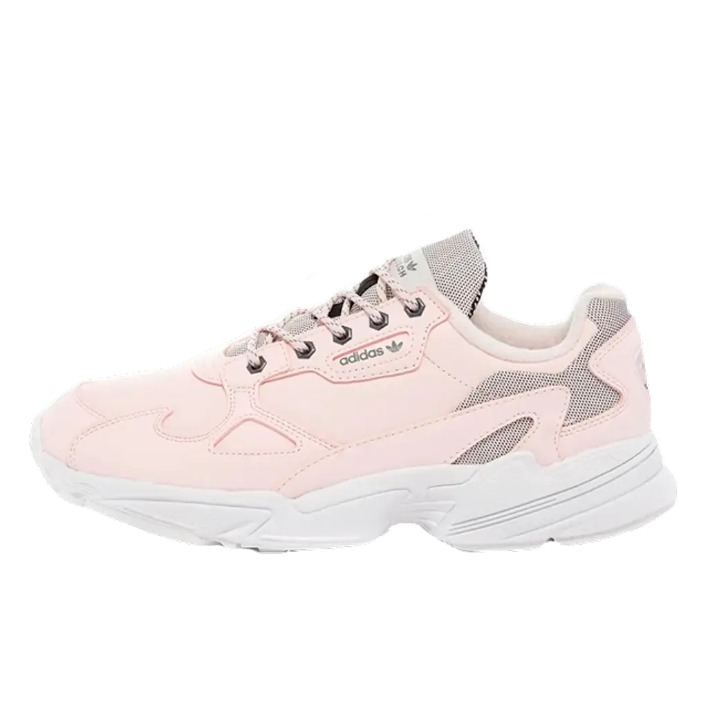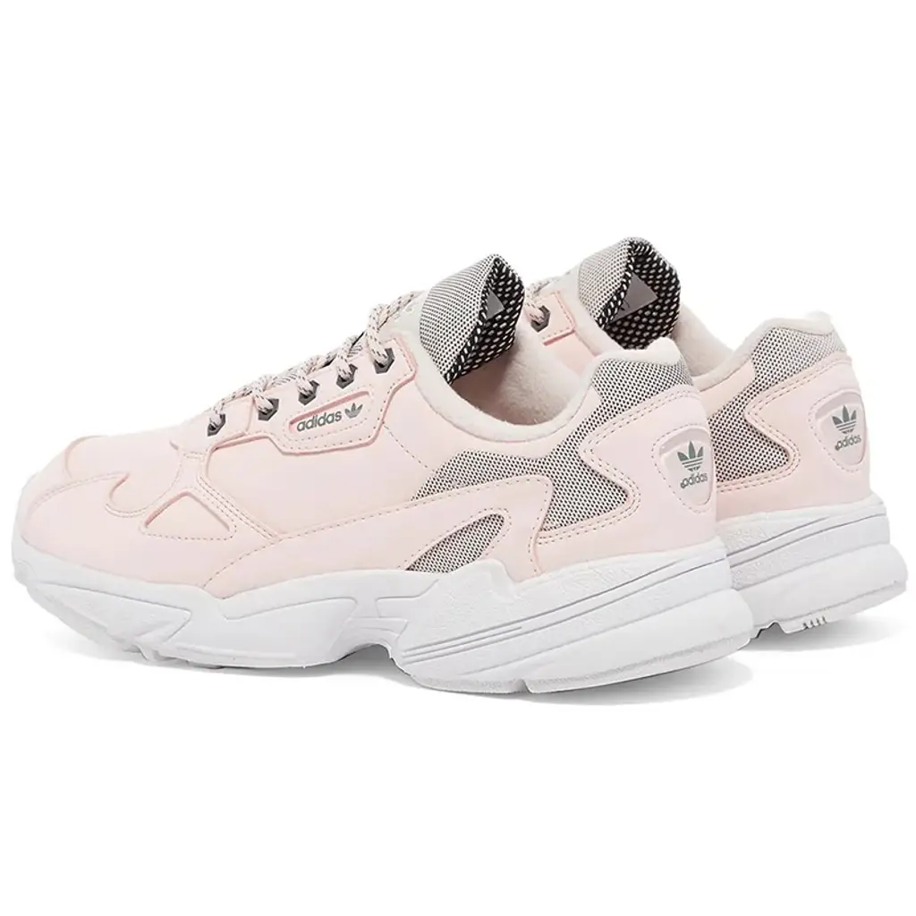 Up top, pastel pink nubuck covers the upper for durability whilst keeping the look soft and subtle, with mesh overlays across the heel and tongue. The soft fleece lining on the inner is sure to keep you feeling cosy all day and takes the comfort levels to the max. adidas branding decorates the lace unit with the classic trefoil logo on the tongue of this pink white Falcon.