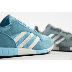 The pair is dressed in a Light Blue inspired colourway. It features premium mesh and suedes with metallic leather stripes. The pair has adidas Boston Super branding on the tongue, heel and on the stripes. The pair is finished off with a blue and white fused midsole and a dark outsole unit.