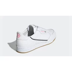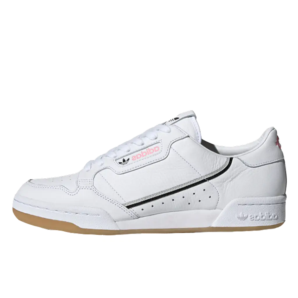 The all-white leather upper gets a vibrant contrast in the form of a sidewall stripe. Now synonymous with the adidas Continental range, this manages to add even more appeal to a timeless trainer. On this pair, different colours feature to either side of the shoe, namely grey, black and pink.