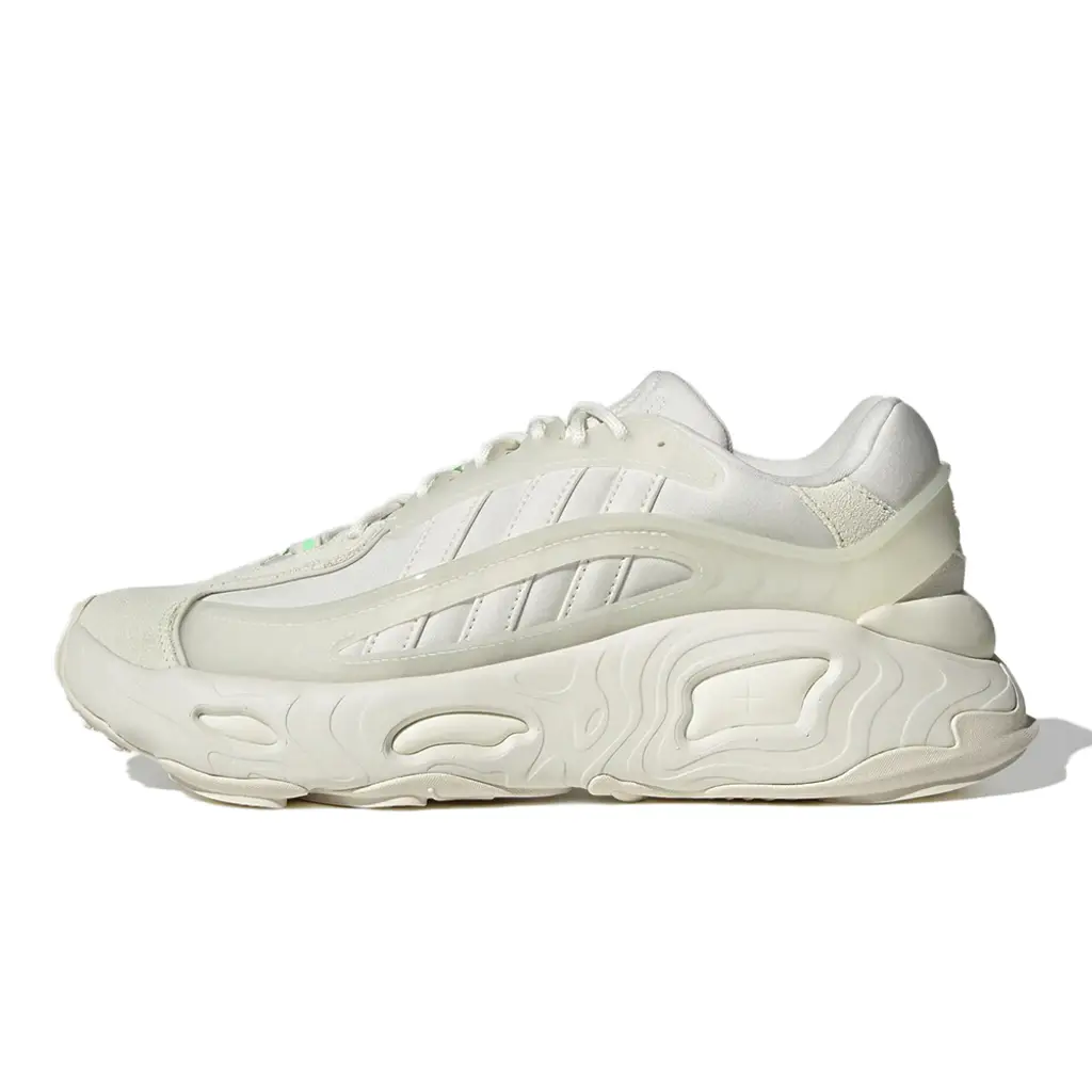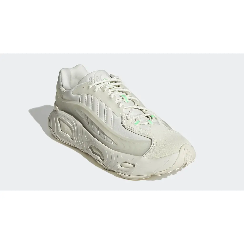 The adidas Oznova Off White Green is a jaw-dropping addition to your sneaker game. This pair starts with an off-white textile upper that’s overlaid with curved horizontal caging and suede panelling along the toe box and bottom eye stays. The medial side has signature Three Stripes stitched on for visual-led branding. Hits of neon green enter via the tongue and the loops keeping the lace-up fastening in place. The midsole is coloured in the same off-white hue as the upper and continues to play on texture and proportion: it has a chunky silhouette traced with organic shapes and backed with grippy pebbles underfoot.