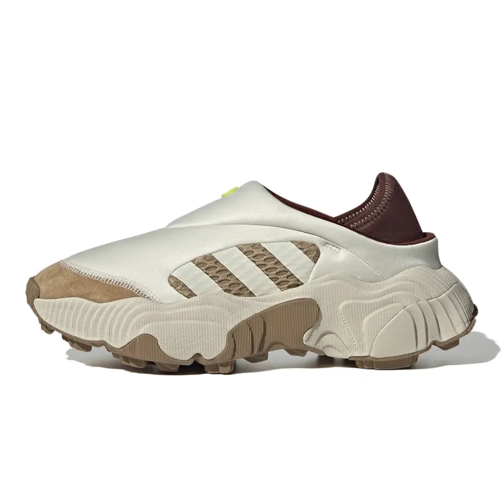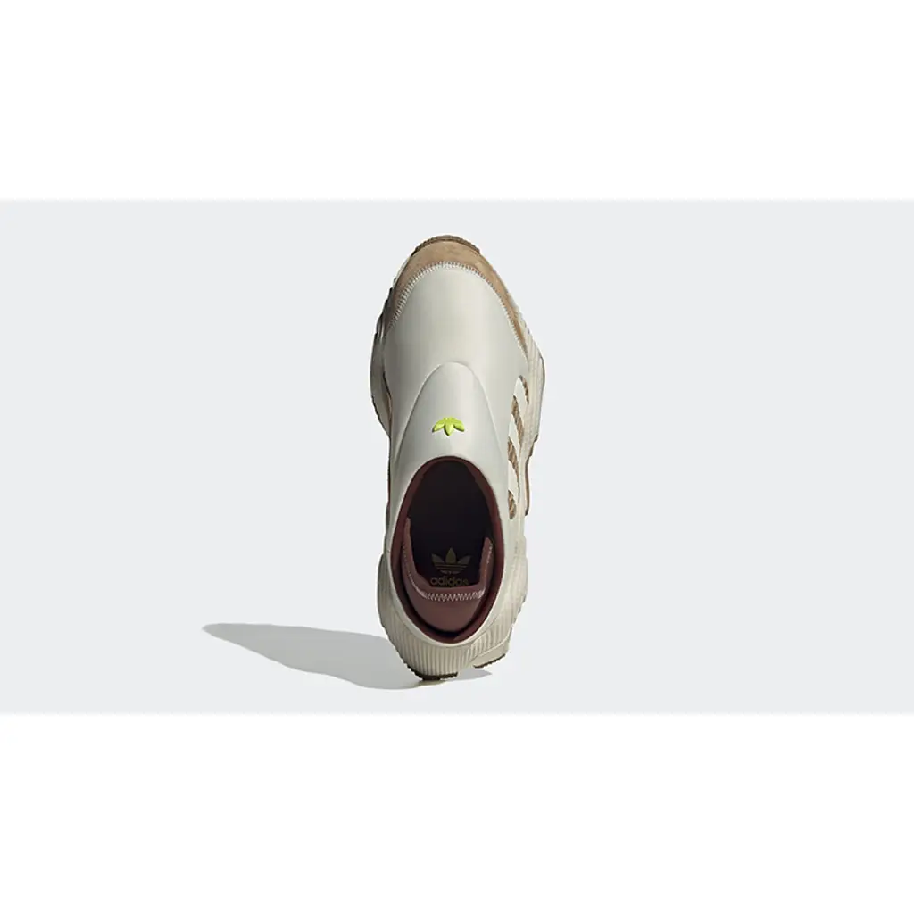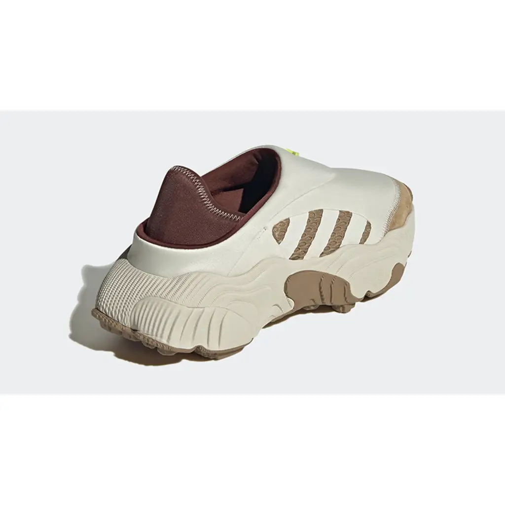This Rovermule has a shiny white neoprene upper with a suede Cardboard brown toe cap and a Cardboard brown mesh midsole cutout showing off the adidas Three Stripes as white decals. At the rear is a dark cocoa brown collapsible heel that allows the wearer to alternate between a sports trainer or a casual mule. A lime green adidas Trefoil badge stands out on the tongue section. A White and Cardboard brown 3D sculpted sole unit that’s borrowed from the Adilette 22 finishes off the style of these kicks.