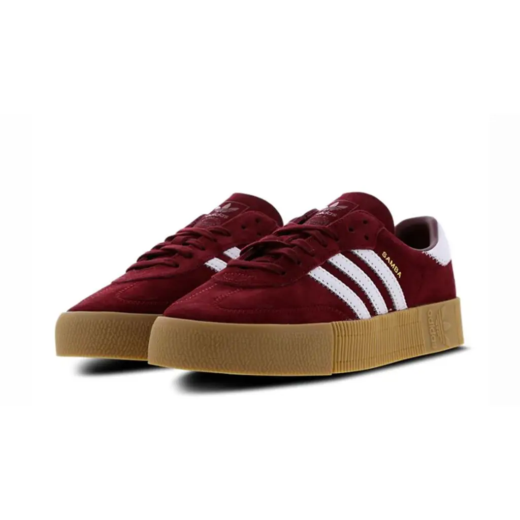 Dressed in luxurious suede and leather, the adidas Samba Rose Maroon Gum Womens boasts a premium aesthetic with endless street style potential. Complete with adidas’ signature Three Stripes branding in contrasting white on the side walls and a golden SAMBA logo, this pair is a classic with a modern twist.