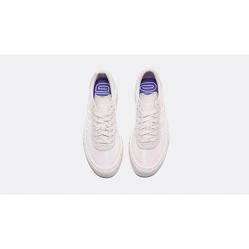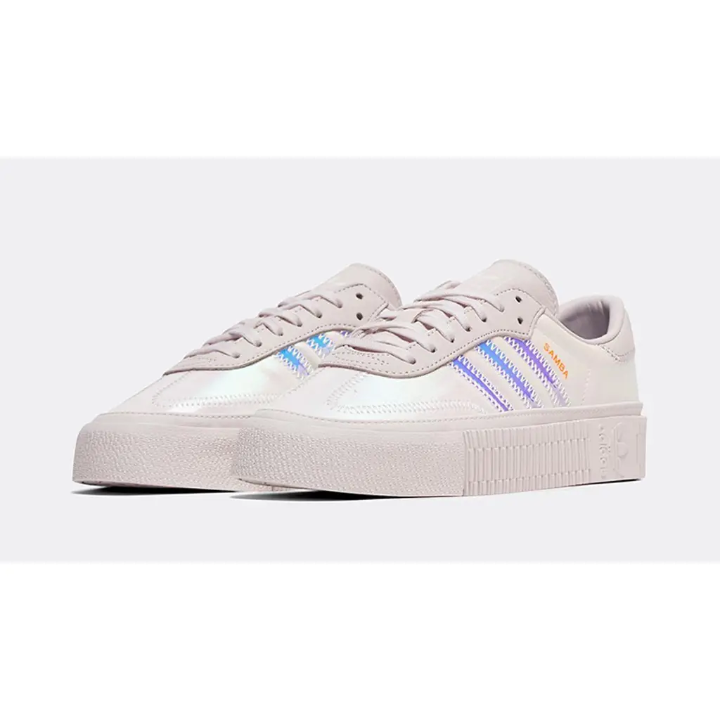 Get ready for the party season with this white and iridescent Samba Rose, featuring a colour changing, shimmering textile across the side panels that create the iconic 3-Stripe logo. The clean white upper also changes colour in the light, shining with slight hues of pink, purple and blue for a super pretty finish to this popular silhouette.