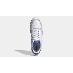 Crafted from a neat blend of leathers, supple suede and synthetics, the uppers take on a panelled appearance and showcase classic adidas branding in the form of perforated three stripe logos down each side. Details are featured in electric-blue to contrast the otherwise white appearance perfectly, making these a subtle pair that will no doubt garner a lot of wear.