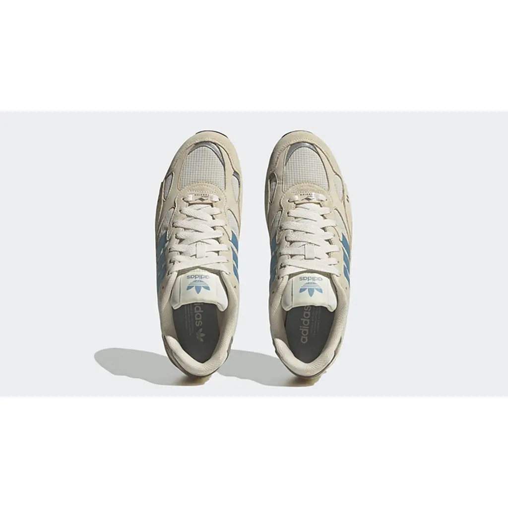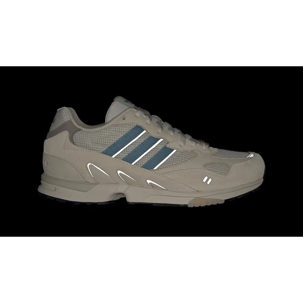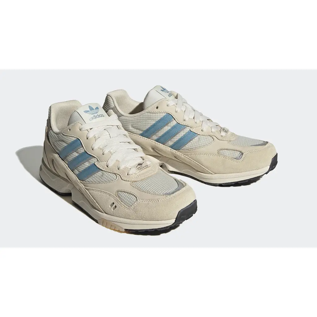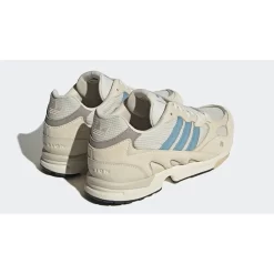 This Torsion Super starts out with a gridded mesh base in core white and light grey. The suede and leather overlays on the toe cap, mudguard, eye stay panel, side walls and heel panel are all in creamy wonder white. The ribbed grosgrain Three Stripes on both the medial and lateral mid-panels are in preloved blue. The edges of the Three Stripes have a 3M reflective finish just like the other vamp accents. Preloved blue repeats on the tongue branding. A wonder white midsole and a black rubber outsole with tan, blue and grey accents round out the look of this sneaker.