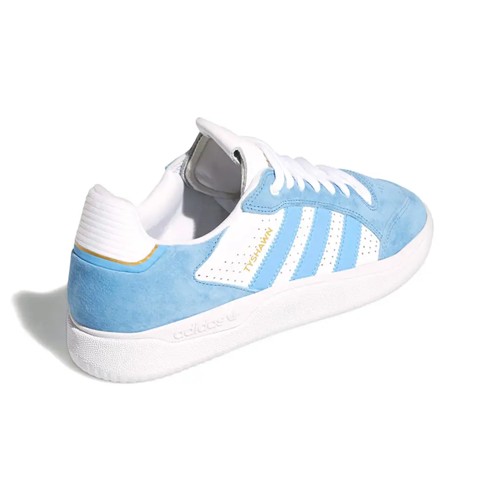 Made for skateboarding and strutting, the adidas Tyshawn Low Sky Rush Blue has performance-enhancing elements and a stylish look. This low-top shoe’s upper features a mix of smooth white leather base and dreamy blue suede accents. Touches of gold via the heel and Tyshawn branding at the side panel complete the whimsical palette.
