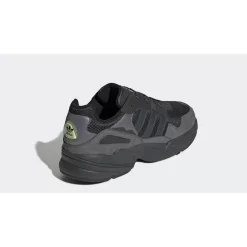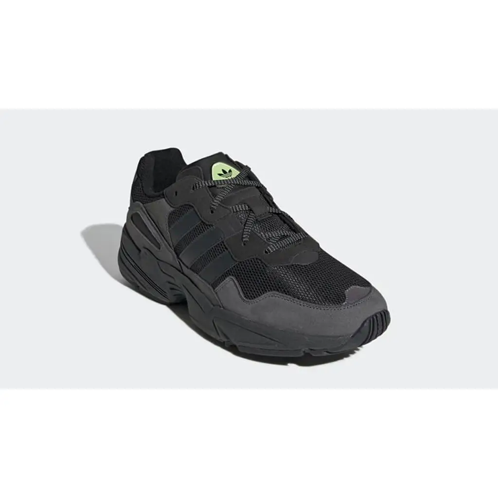 Crafted from a combination of buttery smooth suede and ultra breathable mesh, the Yung 96 Black is a modern rework of the cult classic Falcon Dorf that was all the rage back in 1997. Painted in an all black colourway, dark grey mudguards surround he entire shoe for a pop of contrast, and a bright green Trefoil badge hits the tongue, emphasising the spy equipment influenced look. Down below, a cushioned foam midsole is present, and the shoe’s outsole features an adidas torsion plate for added support.