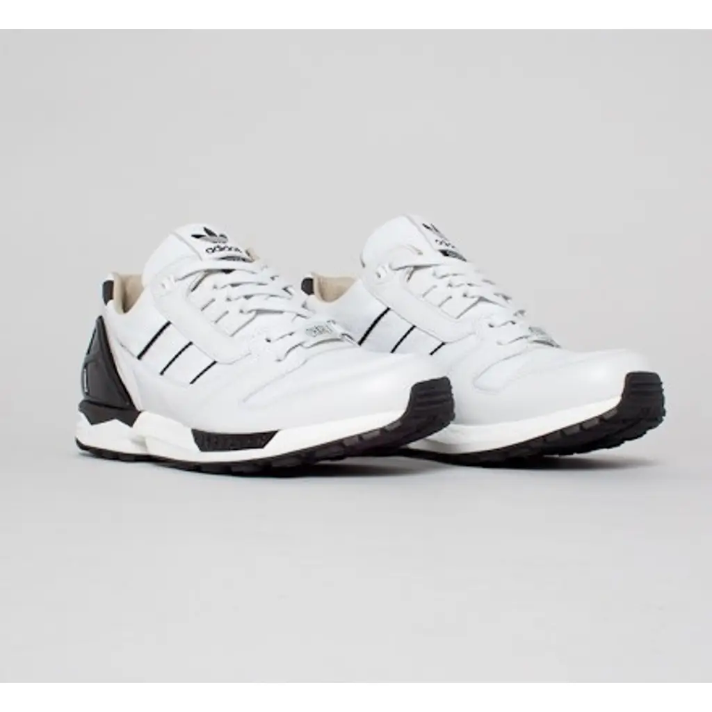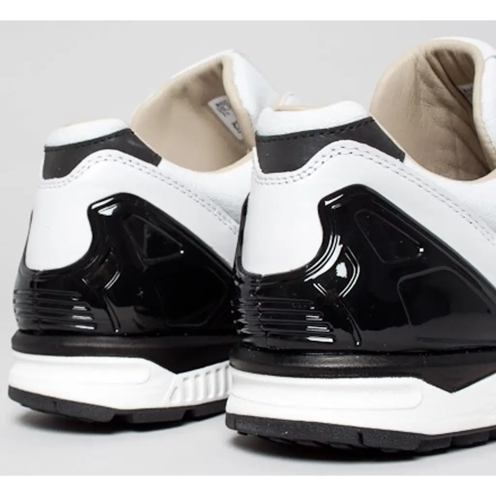 This pair of adidas ZX 8000 is dressed in a black and white mixed colourway. The lovely off white rough canvas upper resembles the sandbags that surrounded the iconic checkpoint Charlie. Also, the off-white smooth premium leather overlays represent the painted wooden panels of this historic structure.