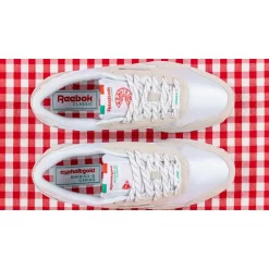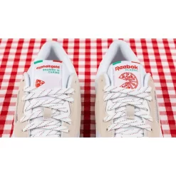 Featuring an ultra clean white mesh upper, light brown suede panels can be found throughout for a very subtle but striking pop of contrast. Green, white, and red accents make their way to the tongue and laces, obviously a nod to Italy’s national flag, and a red pizza graphic also makes its presence known. The classic Reebok “window” hits the lateral side walls, and to round it all off, the insole feature a checked tablecloth pattern, something that has become synonymous with pizza restaurants around the world.