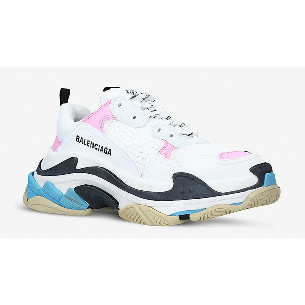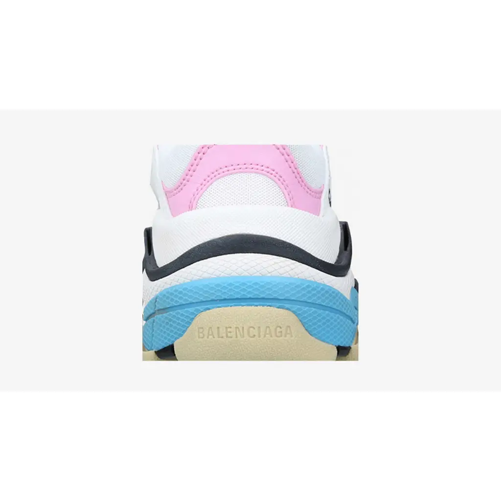 Step into the new season looking and feeling cuter than ever in this bright coloured white pink and blue Triple S Balenciaga. Decked out from heel to toe in premium textiles, everything about this shoe screams luxury. A mixture of durable mesh and smooth leather dress the upper in white with accents of bubble gum pink that add a pop of colour around the heel and collar. Pull tabs on the tongue and heel allow for quick and easy adjustments for the perfect fit with two-tone rope style laces.