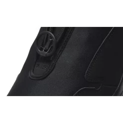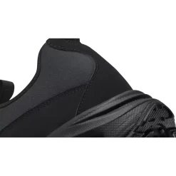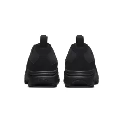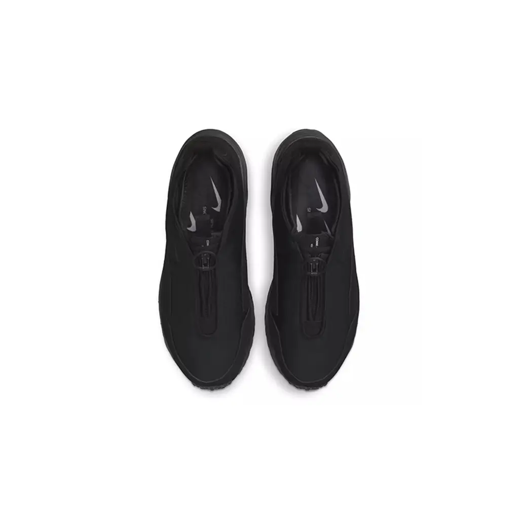This cross-training shoe has an all-black upper, from heel to toe. The base is a comfy neoprene while the overlays are sumptuous nubuck leather. Foregoing traditional laces, this pair has a zip-up closure with a large round zipper pull tab. Simple COMME des GARÇONS HOMME PLUS text branding is printed on the upper part of the tongue. Nike branding is subtle with an embossed black mini Swoosh on the lateral mid-panel, near the collar. An all-black sole unit housing an exposed Nike Air bag at the heel caps off the design of this sneaker.