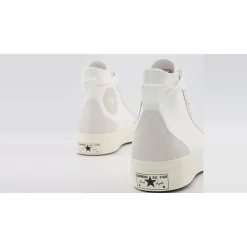 The uppers are crafted entirely from Converse’s signature canvas fabric, with grey suede panels overlaying for a neat textured look. The label’s iconic star logo is present on either side, with a convenient lace tab at the heel used to tie the laces around the back of the shoes for a contemporary look.