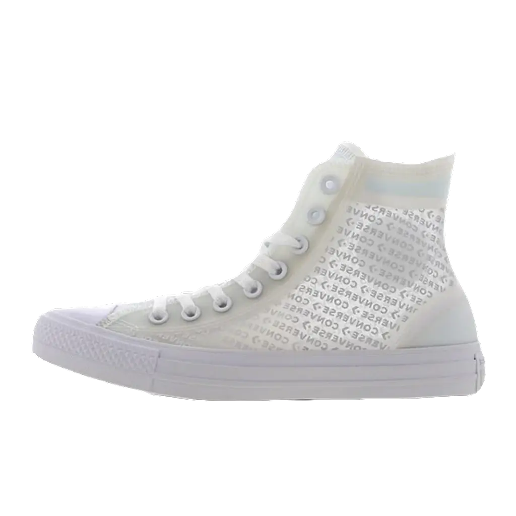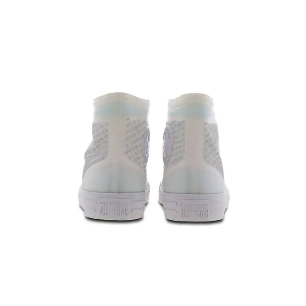 The signature silhouette gets updated and reworked with a repeated logo pattern across the translucent sidewalls. The canvas upper has been switched up to a semi-transparent textile, with overbranding in white across this translucent Converse Chuck Taylor Hi.