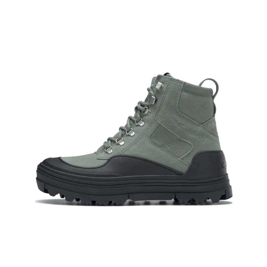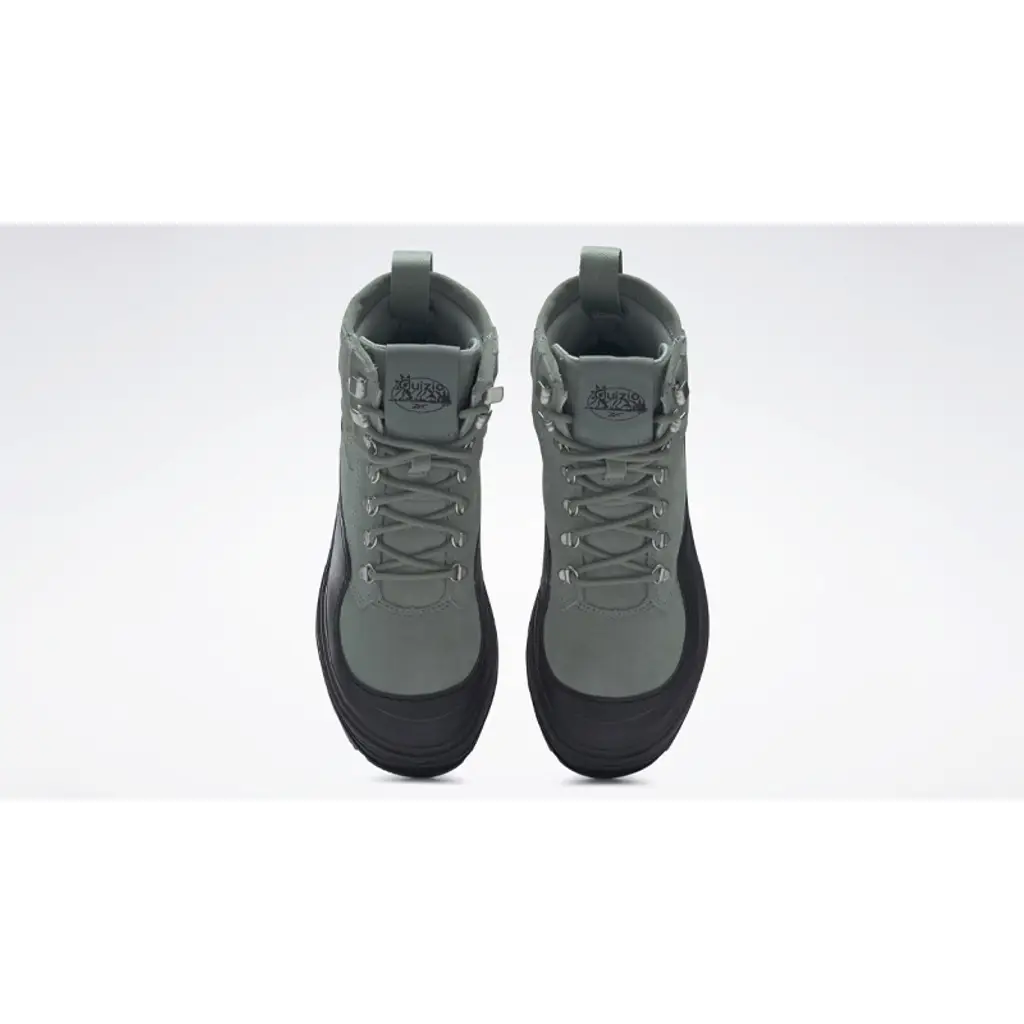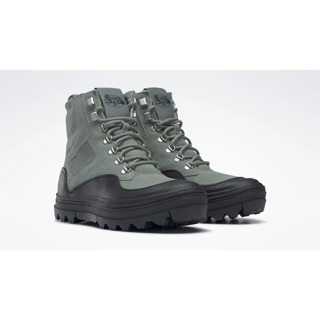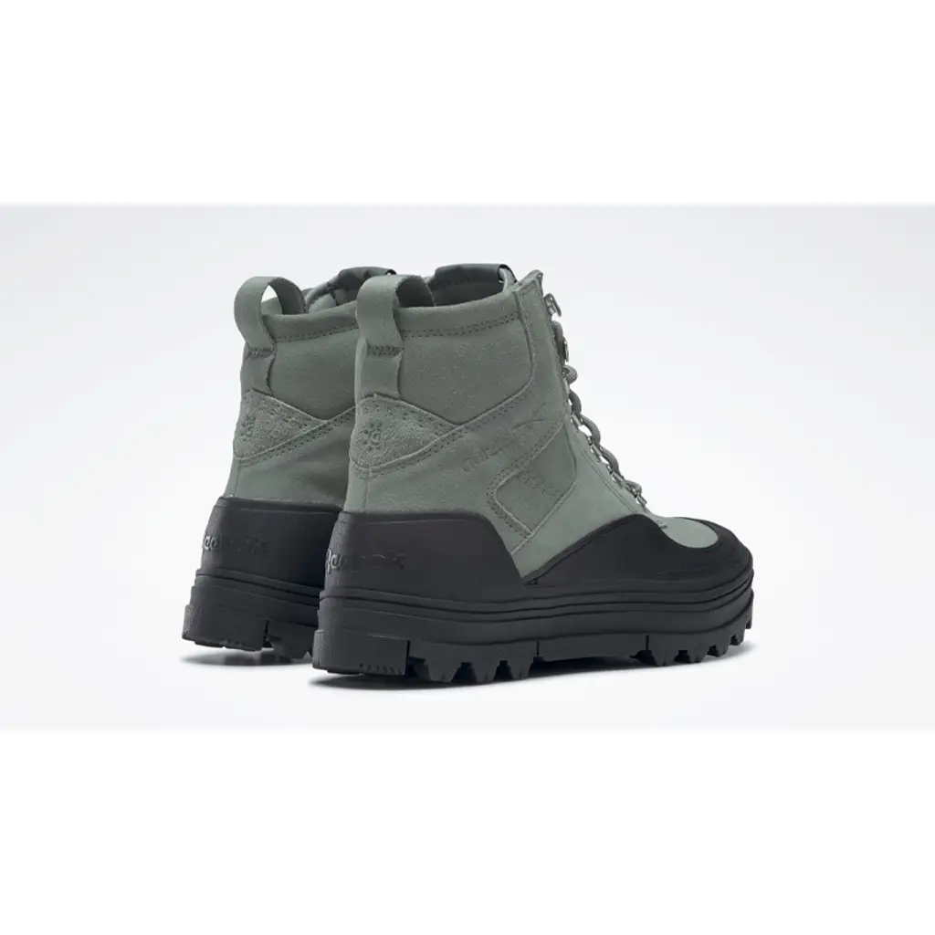 Reebok has teamed up with New York-based designer Danielle Guizio to drop a fun, utilitarian-inspired style: the Danielle Guizio x Reebok Club C Cleated Mid sneaker boots in Harmony Green. The faded-green upper is rendered in smooth suede in a panelled construction that extends up to the ankle. The D-ring lace-up closure amplifies the outdoors theme, as do the heavy-duty trail outsoles which are detailed with deep, chunky ridges for perfect traction on more challenging terrain. The black midsole is framed with tonal leather panelling for reduced abrasion. Finally, the tongue proudly spotlights the clothing brand’s logo.