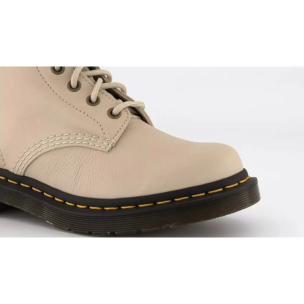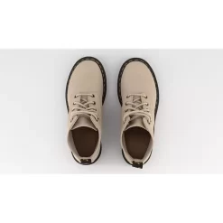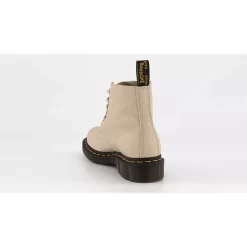 Dr. Martens revamps the 101 6 Eye Boots in easy-to-style Parchment Beige. The upper is made from panels of leather that’s gently pebbled for an effortless, worn-in look. Tonal threads hold the side panels and back overlays perfectly in place without detracting from the minimalist silhouette. The front is punctured with metal eyelets that are threaded with tubular laces. Au lieu of yellow stitches, you get tonal ones just above the midsoles. The signature branded pull tab on the heels remains, though. Underfoot, deep ridges provide excellent traction for urban grounds and beyond.