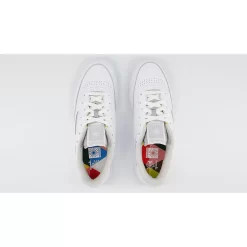 This Reebok Club C is minimalist, with an all-white leather upper from heel to toe. The terry cloth sock liner is off-white, leaning towards light grey, while the tongue is a light beige. The midsole is also white but the outsole is a light grey. The Eames logo in light grey is stands out on a mid-panel cut-out. The tongue is co-branded, featuring both Reebok and Eames branding.