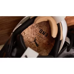 Made in collaboration with UK retailer END Clothing, this chunky shoe combines black nubuck and leather with a stacked white sole underfoot. The perfect setting for dual-branding, the pull tab and cork footbed find light in the shadows, with earthy wooden suedes and concrete leather overlays wrapping around the heel. An extension of the IMEVA cushioned midsole, a semi-translucent gum rubber outsole takes the sneaker to new heights.
