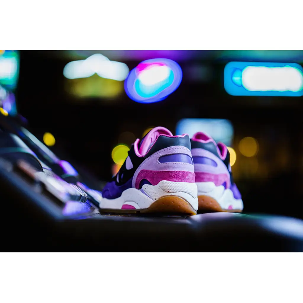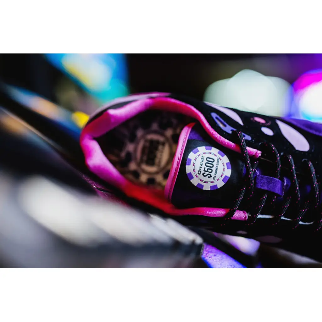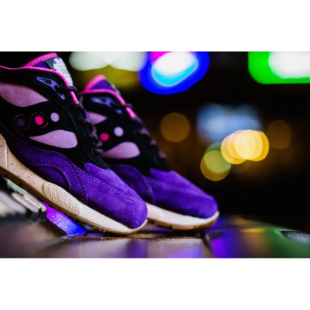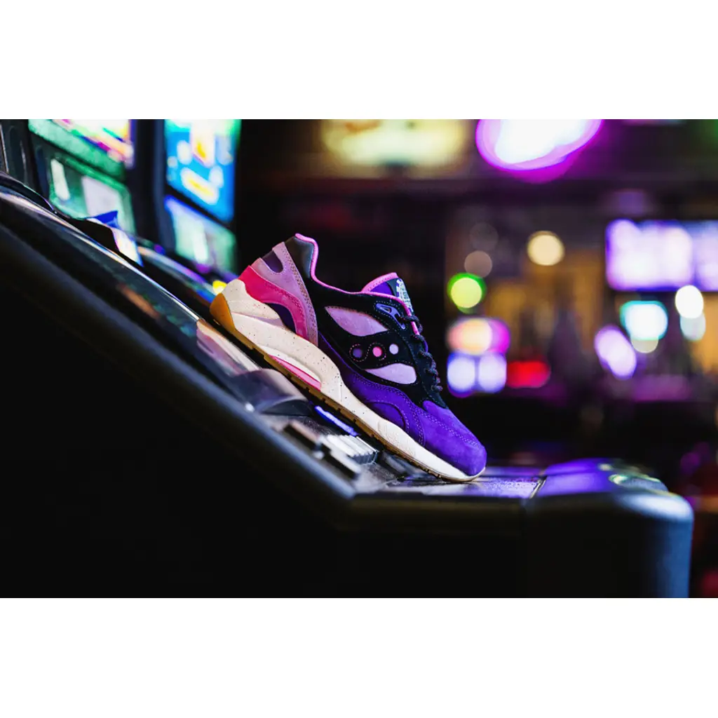 This Saucony G9 Shadow features a selection of pink and purple suede on the upper. It has black suede panels and a black leather heel tab. The shoe sits on top of a natural gum outsole and white speckled midsole. The shoe is finished off with a rope lace and an embroidered $500 poker chip, aka a “Barney” on the tongue label.