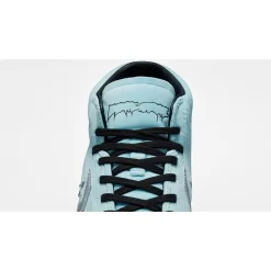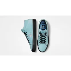 This mid-cut Converse Pro swaps out its usual leather upper for a velvet material in the titular Cyan Tint. Eye-catching chevron and star branding stands out in metallic silver on the medial and lateral mid-panels of the shoe. Metallic silver FA logos embellish the tongues. Contrasting Black comes in the form of the CX foam sock liners and the laces. “Louie” and “Cons” branding adorn the insoles with a printed sky background. A black sole unit with grippy treads caps off the look of these kicks.