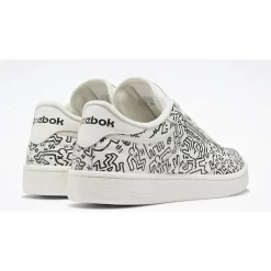 The print on this Reebok Club C‘s leather upper reflects the all-over black-and-white print on his walls. Reebok branding in black and white appear as a cut-out on the mid-panel and on the heel tab. The Keith Haring logo is on the tongue tab. The midsole has a dotted texture and is all white like the outsole.