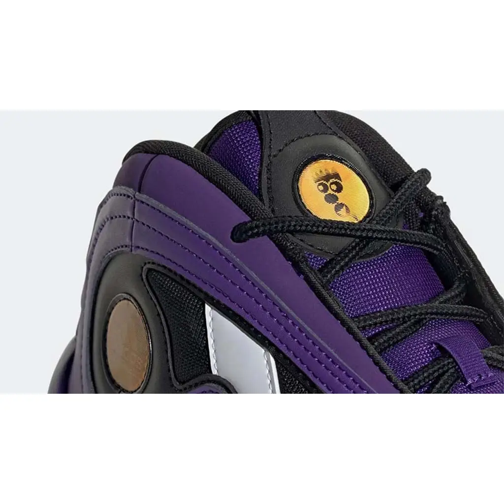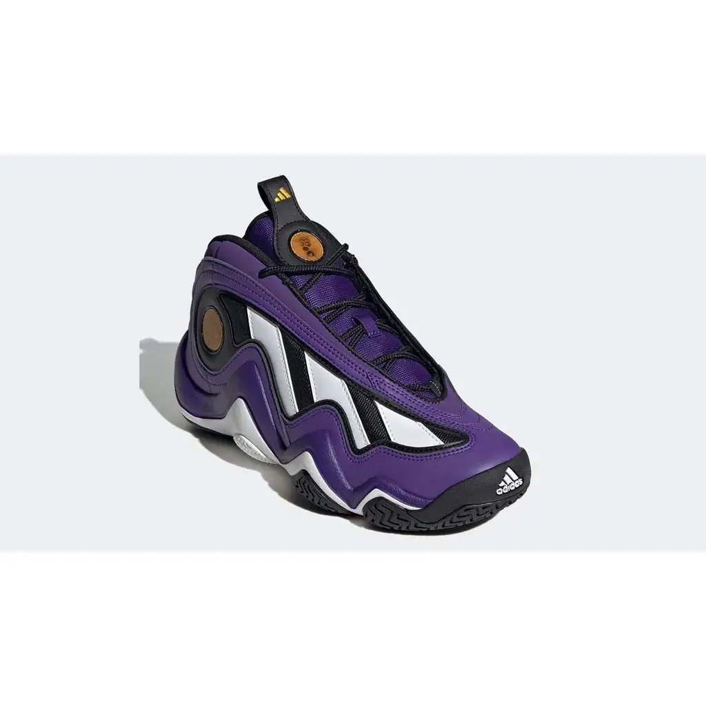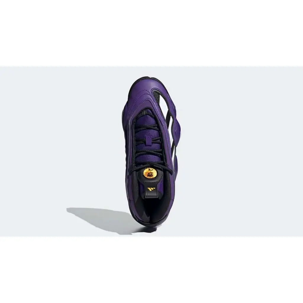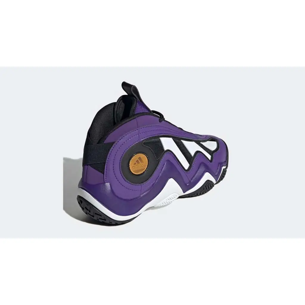 A bit of trivia: this Crazy 97 was the one worn by Kobe Bryant during the 1997 NBA Slam Dunk Contest. This shoe’s upper is dressed in the purple, black and white colours of the Lakers, with purple on most of the overlays and black on the mesh base and liners. The Three Stripes on the lateral side of the shoe are white. A gold adidas medallion can be found right behind the Stripes on the lateral side, matching the gold branding on the tongue and the Three Stripes on the tongue pull tab. A white midsole and a black herringbone-patterned outsole cap off the style of this sneaker.