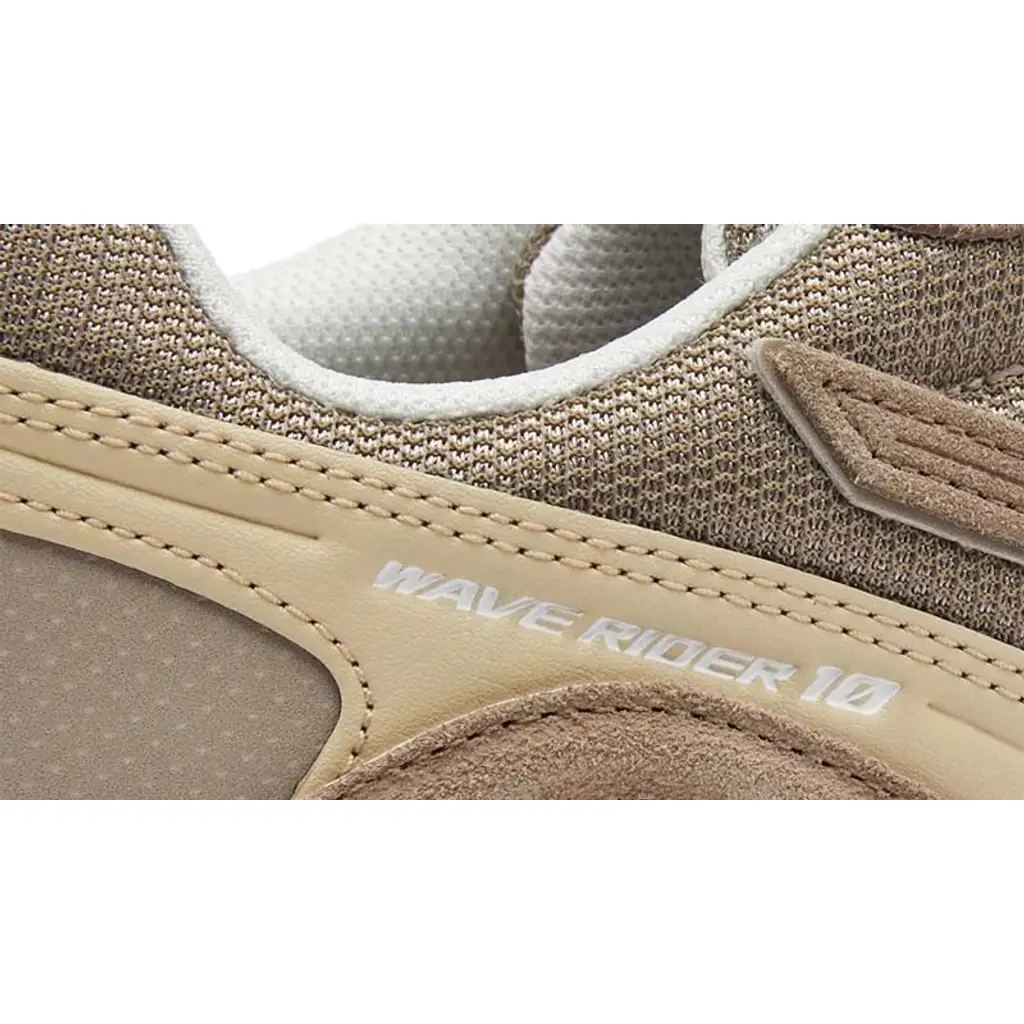 This Wave Rider 10 has a “Khaki/ Fallen Rock/ Papyrus” colour arrangement. The toe box is a breathable perforated Khaki suede while the base is a tightly woven mesh.The rest of the suede and leather overlays are a combination of Khaki and Papyrus, including the iconic RunBird logos on both the medial and lateral mid-panels. A cream and grey midsole with thermoplastic Wave technology and a dark grey rubber outsole caps off the style of this shoe.