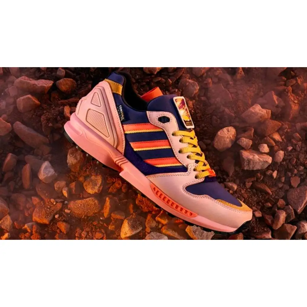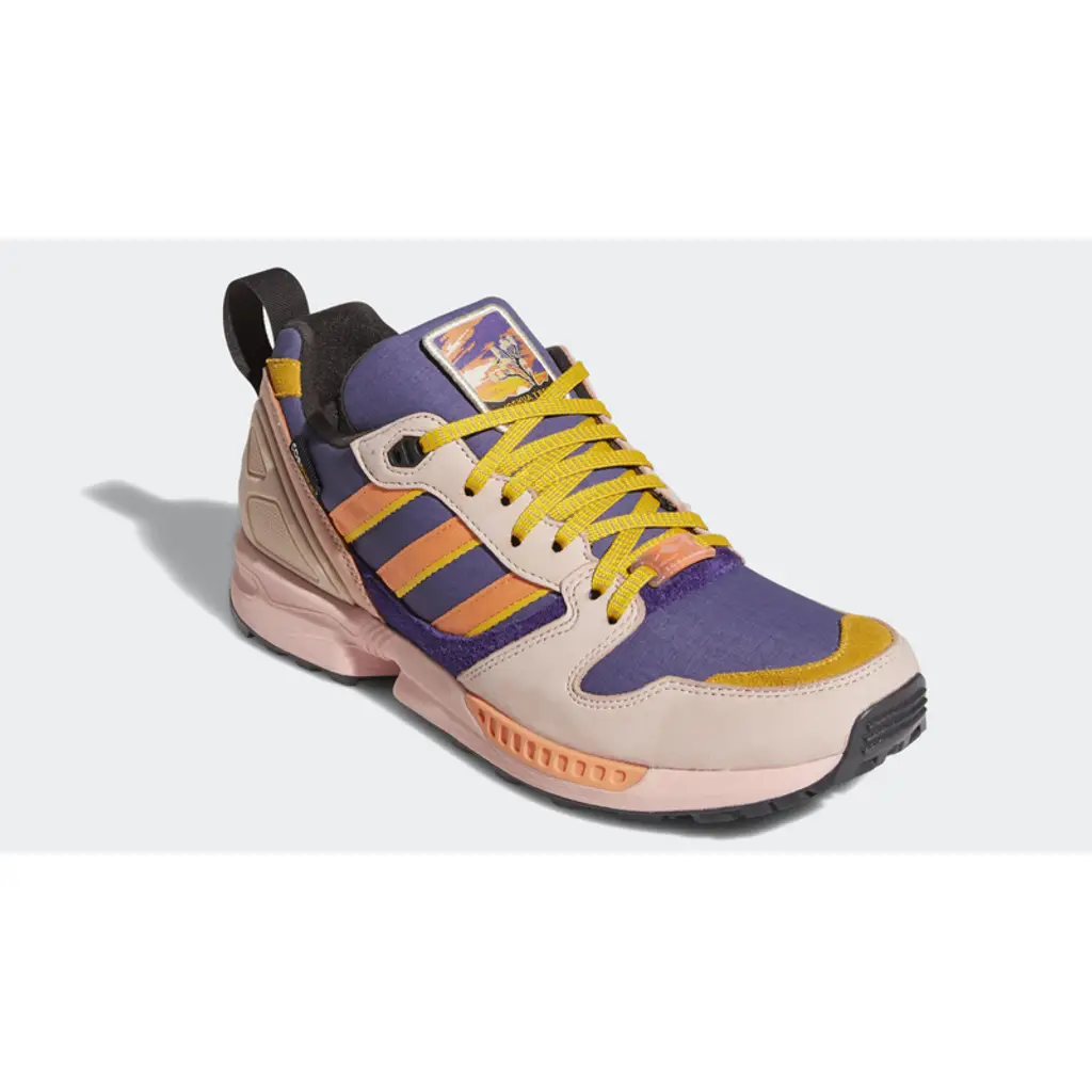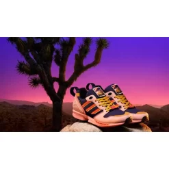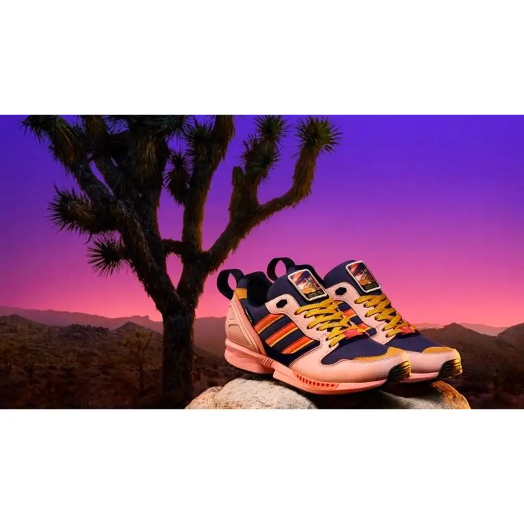 In a nod to the park’s dusty palette, this ZX 5000 comes in rich hues reminiscent of the stunning desert sky above California’s Joshua Tree National Park. There are subtle purple underlays, with blush pink leather overlays and bold shades of orange running throughout the shoe.