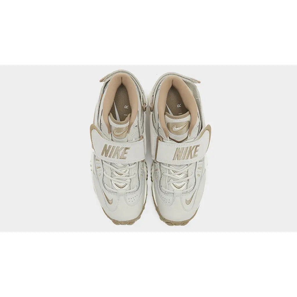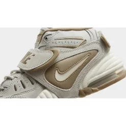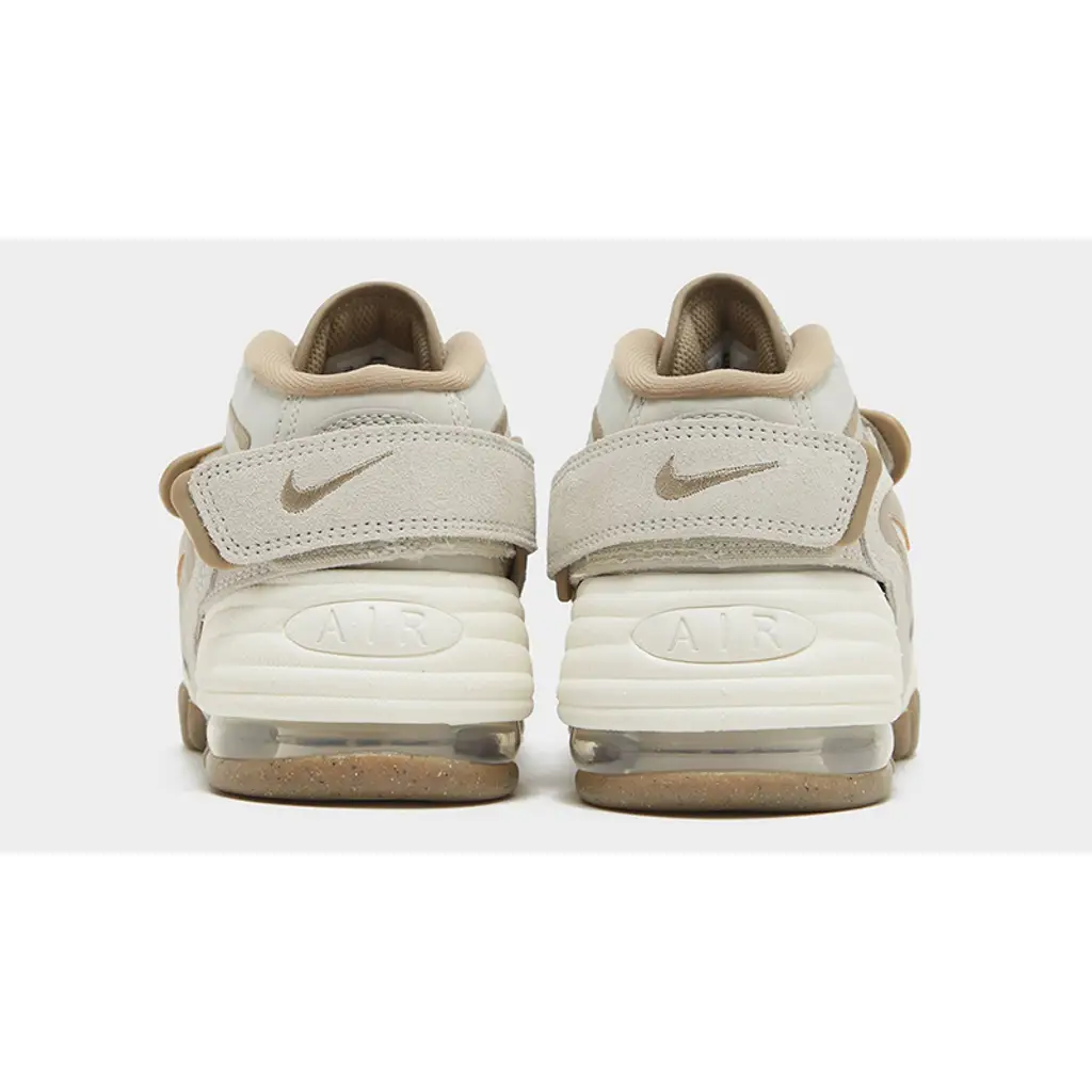 This Air Adjust Force comes in a light bone and khaki colour scheme. The majority of the upper is leather in the titular light bone shade with khaki brown accents on the velcro strap, the inner lining and panel windows featuring cut-out signature profile Swooshes on both the medial and lateral side walls. One-hundred-eighty-degree Air Max units sit atop a white midsole. Wrapping up the design of this shoe is a speckled medium brown gum outsole showing off the brand’s “Move to Zero” Grind technology.