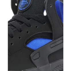 This pair of Nike Flight Huarache OG edition features a Black nubuck upper. It includes Lyon Blue accents on the inner bootie and heel. There is branding on the tongue tag in Lyon Blue with more hits on the insoles. The shoe is finished with a black outsole unit.