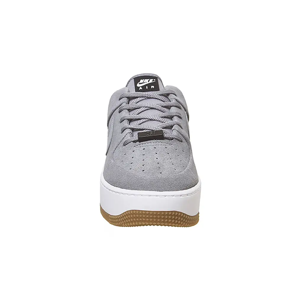 Below the Grey Air Force 1 Sage, a thick white midsole shows off Air branding, with Air cushioning within, finished off with a gum outsole, bringing a slight colour to the shoe and keeping you glued to all surfaces.