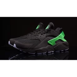 This pair of Nike Air Huarache FB features a black base. It includes a contrasting poison green back-strap with Huarache branding on the tongue and on the back heel. The shoe also features a perforated toe-box and a black midsole. The shoe is finished off with an aluminum-shaded outsole unit.