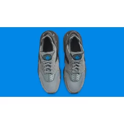 Different shades of grey in different material textures compose the upper. A light grey suede wraps around the toe cap and the mid-quarter extending to the eye stays and matching the laces. The tongue is a greenish grey neoprene. The cut-out quarter is in a darker grey. The heel cages, midsole and outsole are in a conservative black. The titular Laser Blue stands out on the Air Huarache branding embossed on the tongue and peeking out in the middle of the black tread.