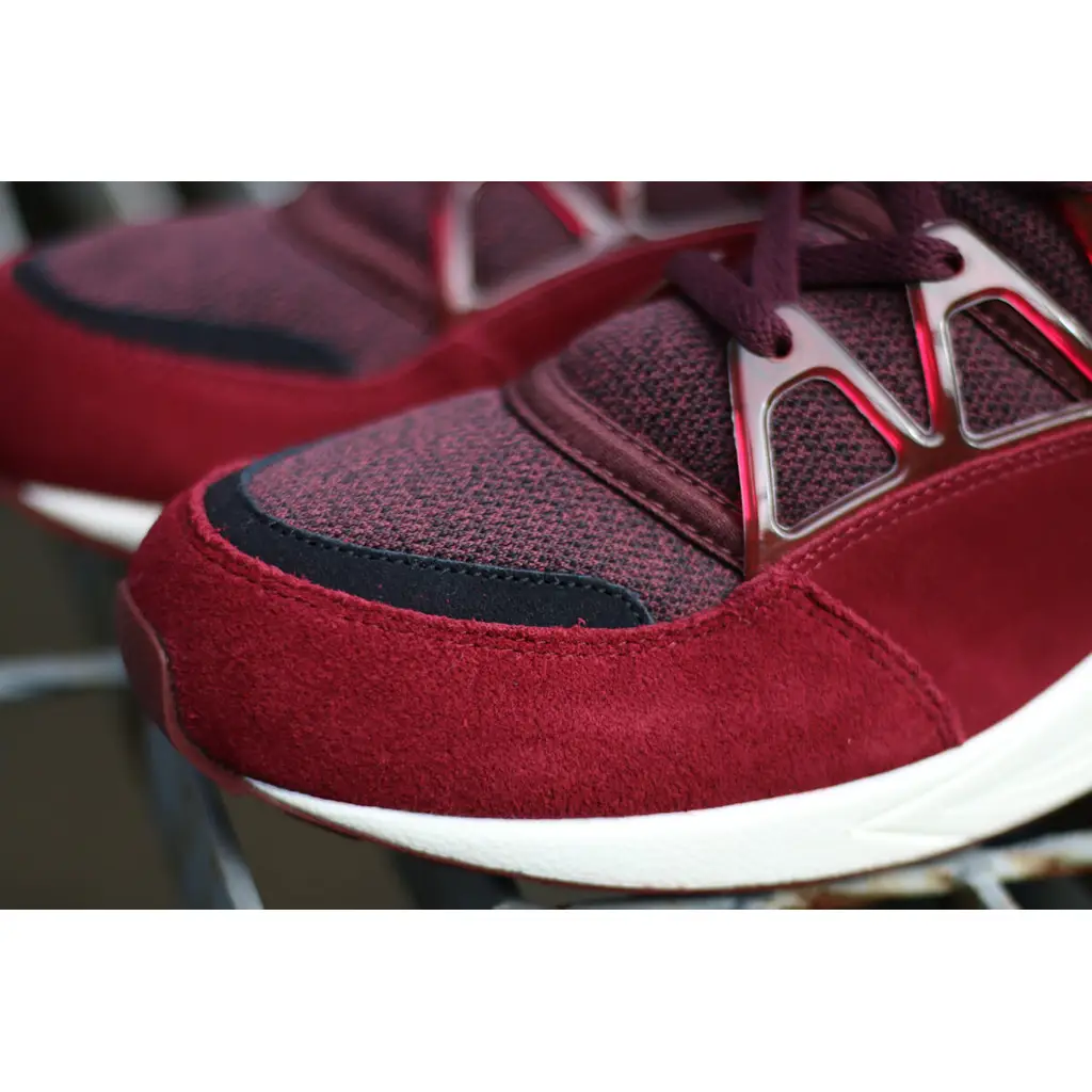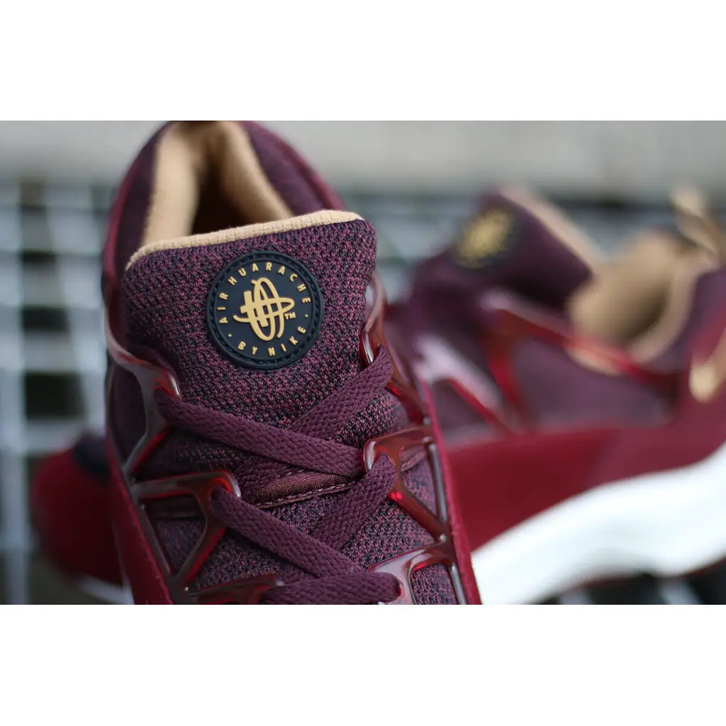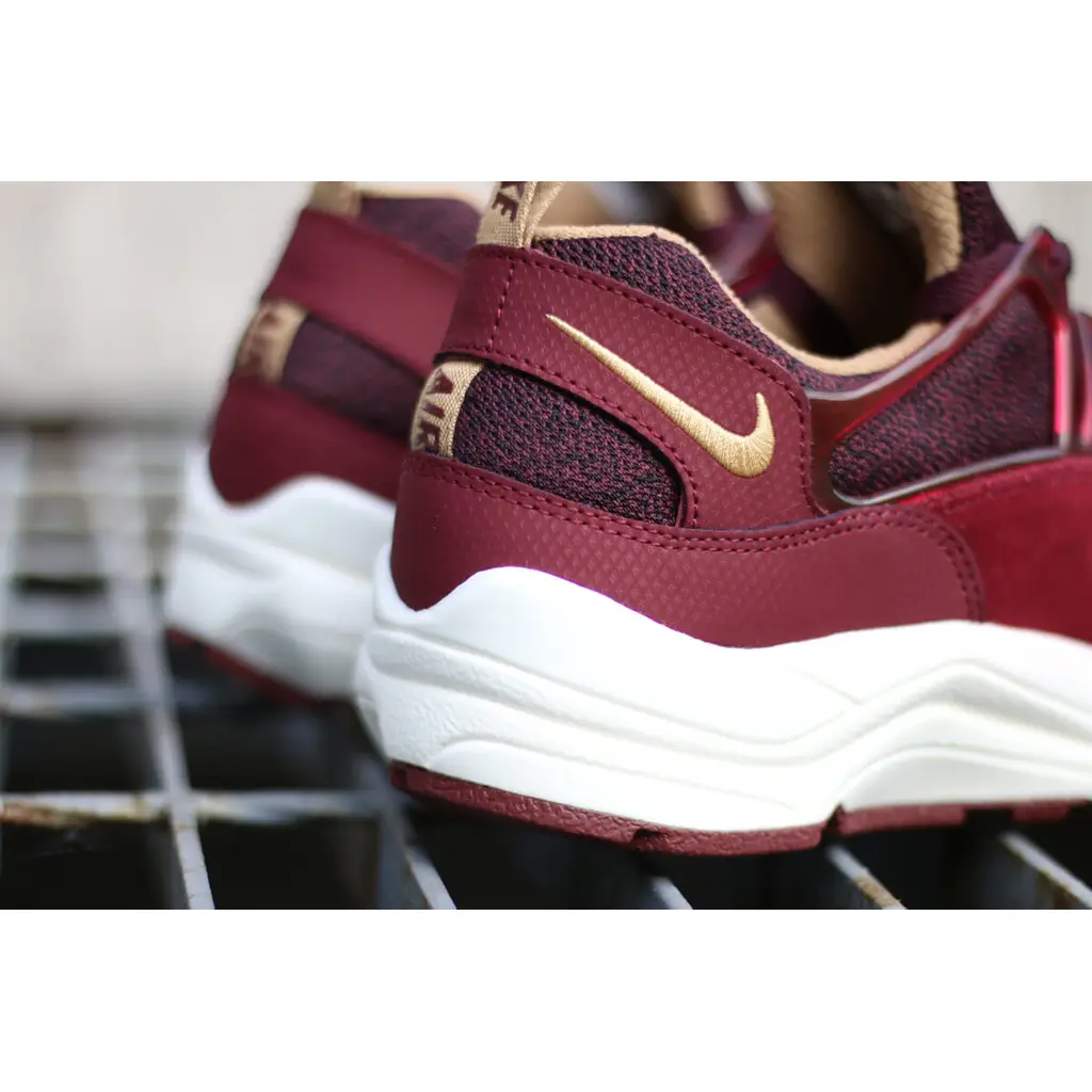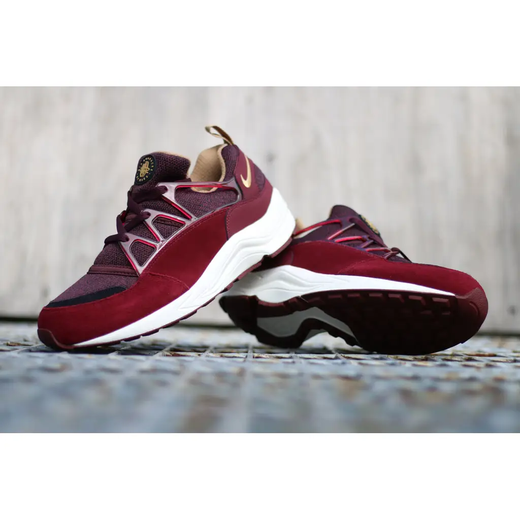This edition of the Air Huarache Light features a dark burgundy slip-on mesh upper with matching burgundy overlays in both suede and a textured synthetic. There are bright red accents hits on the lining, branding and heel pull tab. It includes the classic patch on the tongue with small red swoosh branding on the heel area and also a black moulded translucent lacing system on the midfoot. The pair sits on top of a contrasting white Air-cushioned midsole and is finished a red rubber outsole unit.