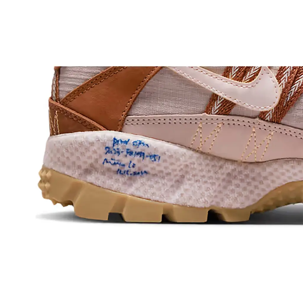 The underlaying ripstop canvas is doused in a coral pink, forming a less aggressive appearance that we had seen on the Jacquemus “Pink” iteration. The Humara’s panelling system is covered in box stitching, giving the upper a greater level of durability that can keep up with the other hard wearing materials and outsole. On the toe guard lies a faded debossed pattern that can also be found on the heel of the shoe, giving the shoe a textured element that begs the question; what was the source of inspiration? On the medial part of the midsole lies a print that mimics a written set of words in blue ball point pen, however from photos, it isn’t quite readable. This could be a possible lead behind the point of inspiration behind the shoe’s make-up, as this detail is normally found on shoes that designers mark up during the construction process. For the time being, we can only speculate as to why this detail has been kept in by Nike, although it’s definitely a piece of storytelling that makes this “Ripstop Coral” edition that much more exciting.