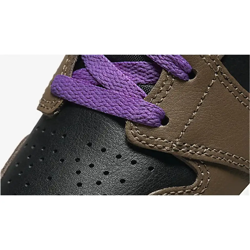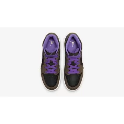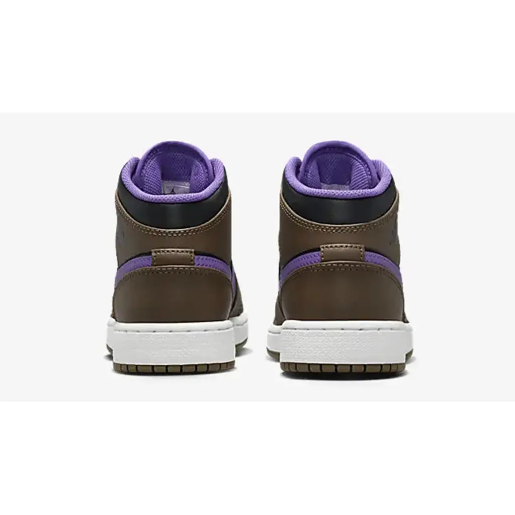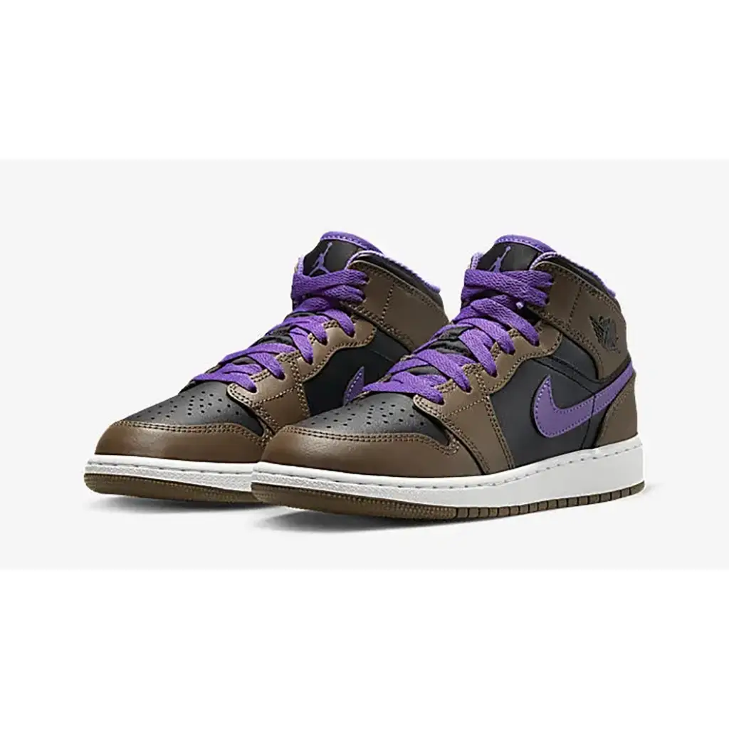 The classic Peter Moore-designed Air Jordan 1 has a sumptuous new iteration that combines purple taro and delicious mocha. Presenting the Air Jordan 1 Mid Purple Mocha. Taking after the Air Jordan 1 Dark Mocha released two years ago, this mid-cut AJ1 has Dark Mocha smooth leather overlays on the toe cap, the mudguard, the eye stay panel, the heel counter and the foxing. The base is black leather, matching the nylon tongue. The signature profile Swooshes on the medial and lateral mid-panels are in the striking titular Purple hue. The laces, mesh sock liner and the tongue lining follow suit. A black Wings logo is embossed on the lateral collar flap. A white midsole and a Dark Mocha rubber outsole wrap up the design of this sneaker.