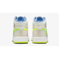 This mid-top AJ1 has a full leather build and a “Platinum Tint/ Volt/ Blue Tint/ University Blue/ White/ Black” colour pattern. The smooth leather base on the toe box is and the outer layer of the eye stay panel is in light-coloured Blue Tint. The tumbled leather overlays on the toe box, the mudguard, the collar flaps and the heel counter are in Platinum Tint. The mid-panels are plain white smooth leather to better show off the Volt-coloured TPU profile Swooshes on the lateral side with layers of University Blue and Black TPU beneath it. The medial side shows off a single Swoosh in the eye-catching Volt hue. Black Jumpman branding can be found on the Volt mesh tongues and the University Blue insole. A Black “Wings” logo is stamped on the lateral side of the collar, matching the laces. A white midsole and a Volt-coloured rubber outsole wrap up the design of this sneaker.