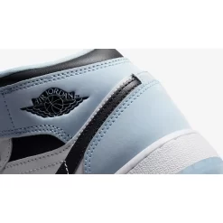 This AJ1 reverses the usual look of its base and overlays on the toe area, with white on the toe cap and ice blue on the perforated toe box. White repeats on the eye stay panel, the mudguard and the mid-panels while ice blue can be found on the collar flaps and hee counter. Black enters the mix via the signature profile Swooshes that glide across both the medial and lateral mid-panels, the nylon tongue and the Wings logos stamped on the lateral collar flaps. The Jumpman logo and Air branding on the tongues are ice blue. A pure white midsole and an icy semi-translucent blue rubber caps off the look of this sneaker.