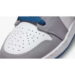 The Jordan Brand’s very first tribute shoe for Michael Jordan designed by the late great Peter Moore, the Air Jordan 1, has a new grey-and-white variation with bursts of cool blue. Take a closer look at the Air Jordan 1 Mid GS White True Blue Grey.