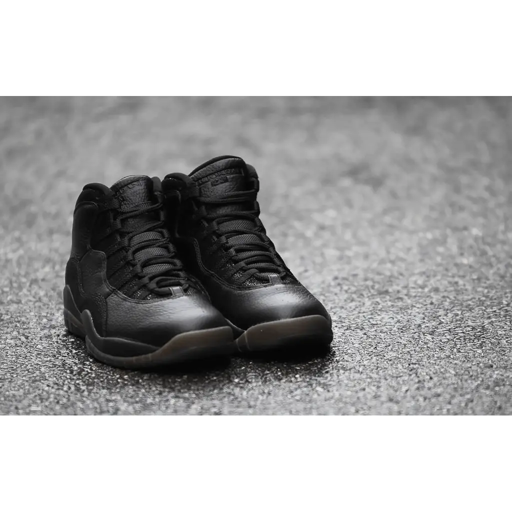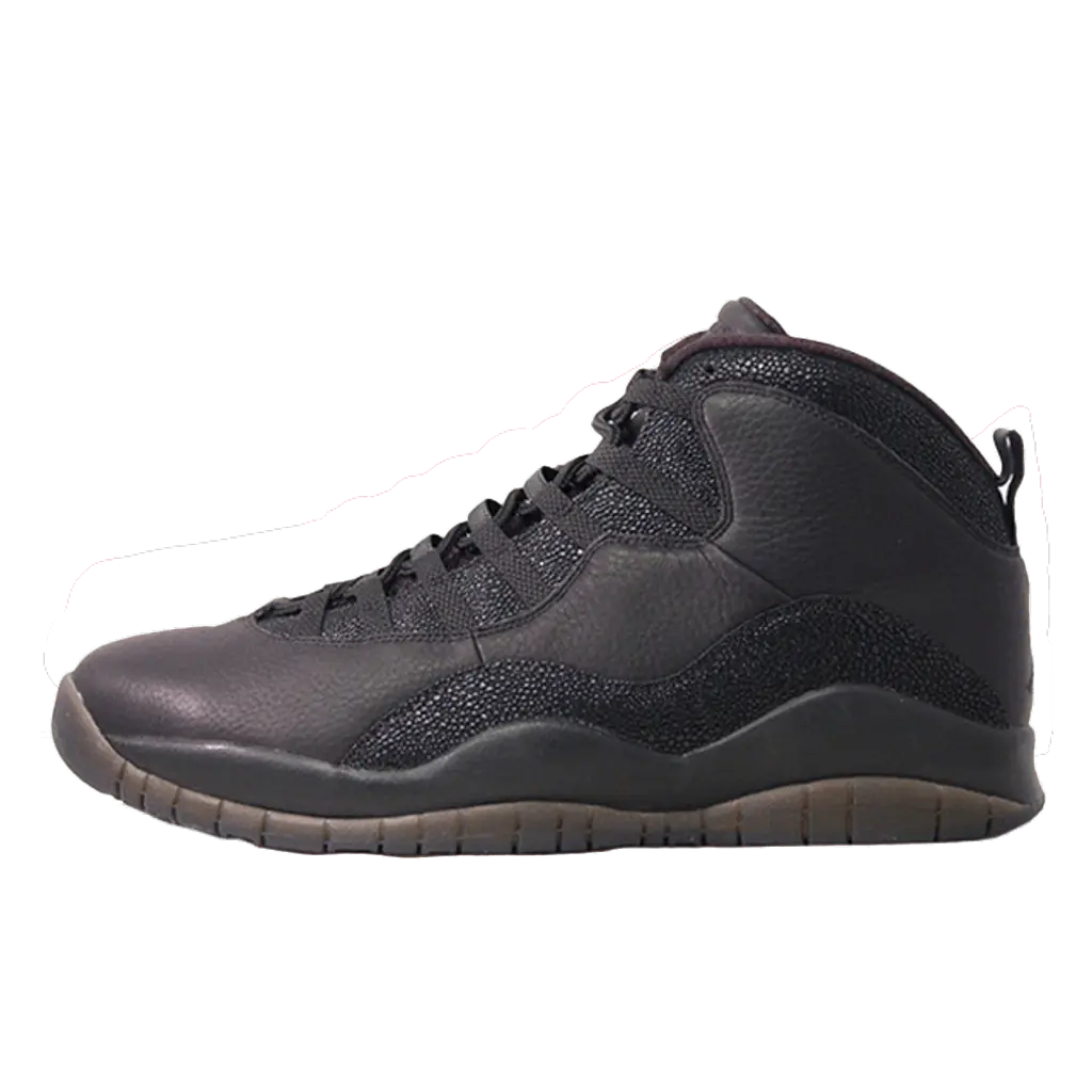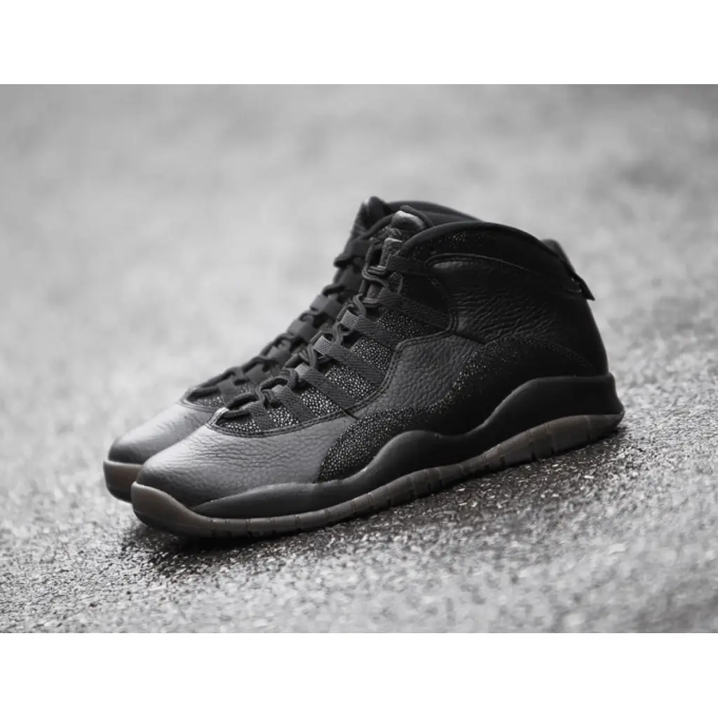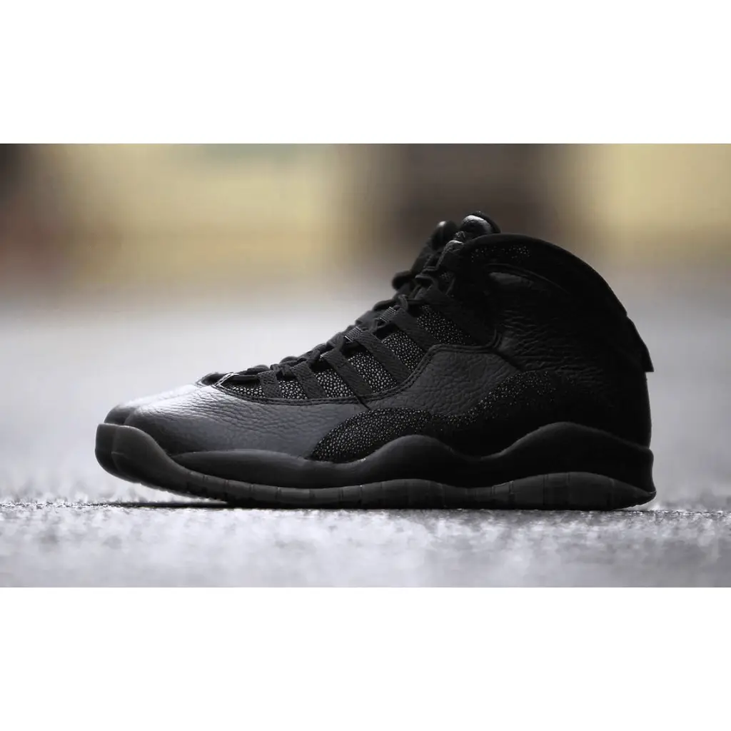 This edition of the AJ 10 is dressed in a metallic black inspired colourway. The pair is crafted with a stingray utilised leather in black. There are similar black hits on the mudguard with scotch grain leather paneling. There are lovely metallic gold accents on the insole with DrakeÂ’s signature emblem of OVO owl. Other details include a Jumpman logo on the heel counter with more branding on the tongue. A set of black laces and a dark sole unit completes the overall look.