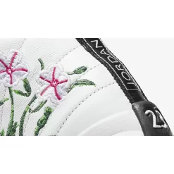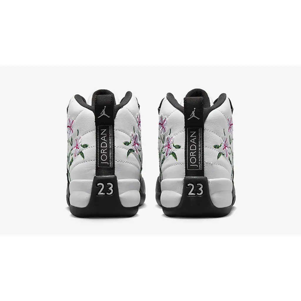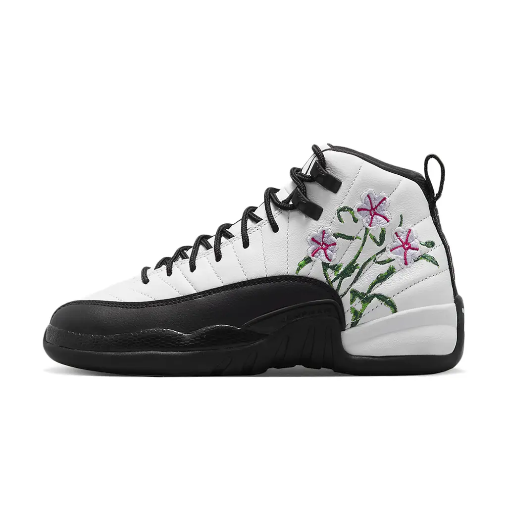 Channel flower power style with the elegant Air Jordan 12 GS Floral White Black! This lovely shoe features a quilted white leather upper with a dual-layered black mudguard consisting of leather and TPU material. It is then decorated with delicate white and pink floral embroidery complete with green stems on the medial and lateral sides. Rope laces and sophisticated eye stays finish off the upper. Underfoot, is a lightweight and stylish sole unit that complements this Air Jordan 12 GS’ fancy look.