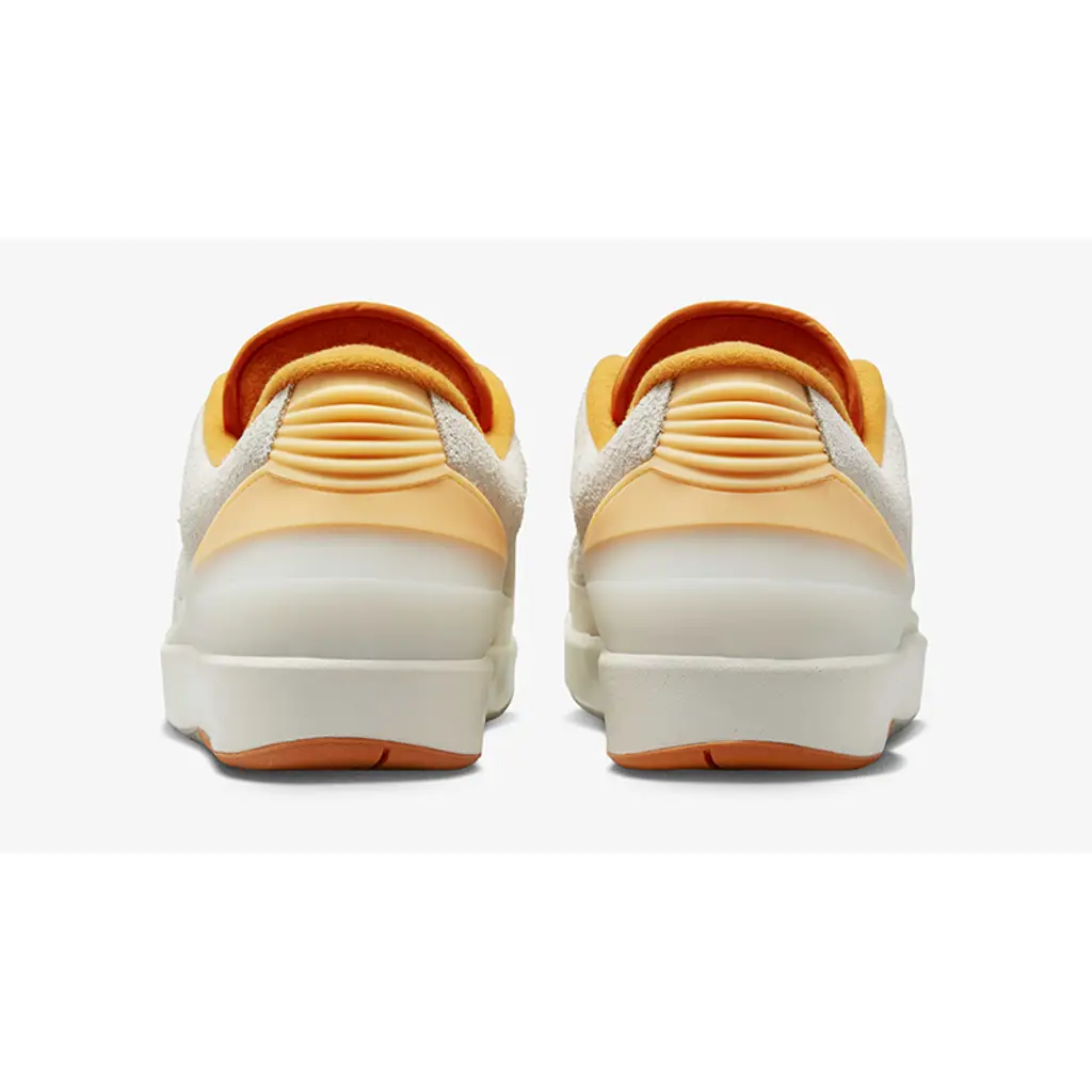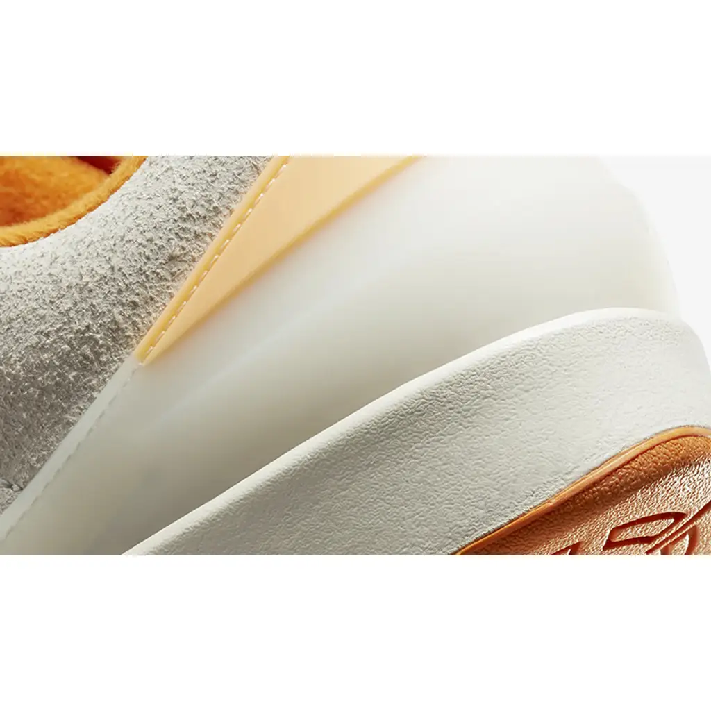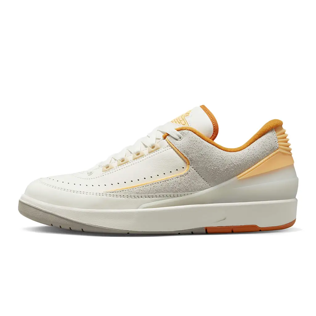 This AJ2 has a “Sail/ Light Curry/ Melon Tint/ Cobblestone” colour palette. A neutral-coloured suede foxing and white tongue contrast with a Light Curry sock liner and tongue piping. A creamy Melon Tint dresses up the TPU heel clip, Air Jordan branding on the tongue and the quarter and collar lining. A comfy all-white midsole and a rubber outsole split into Light Curry on the heel and Cobblestone at the front round out the look of this sneaker.