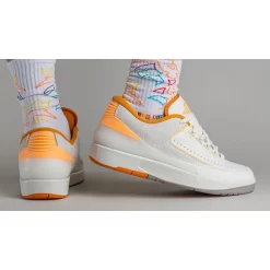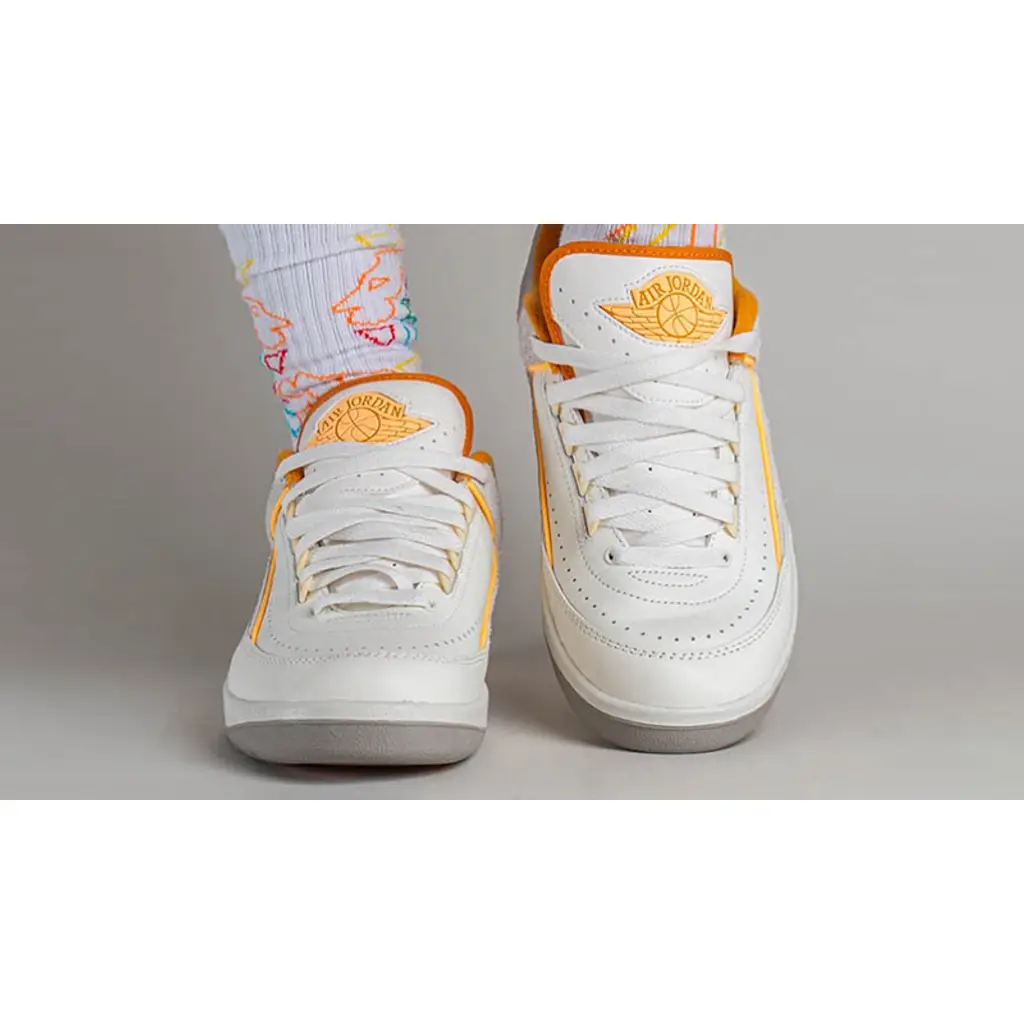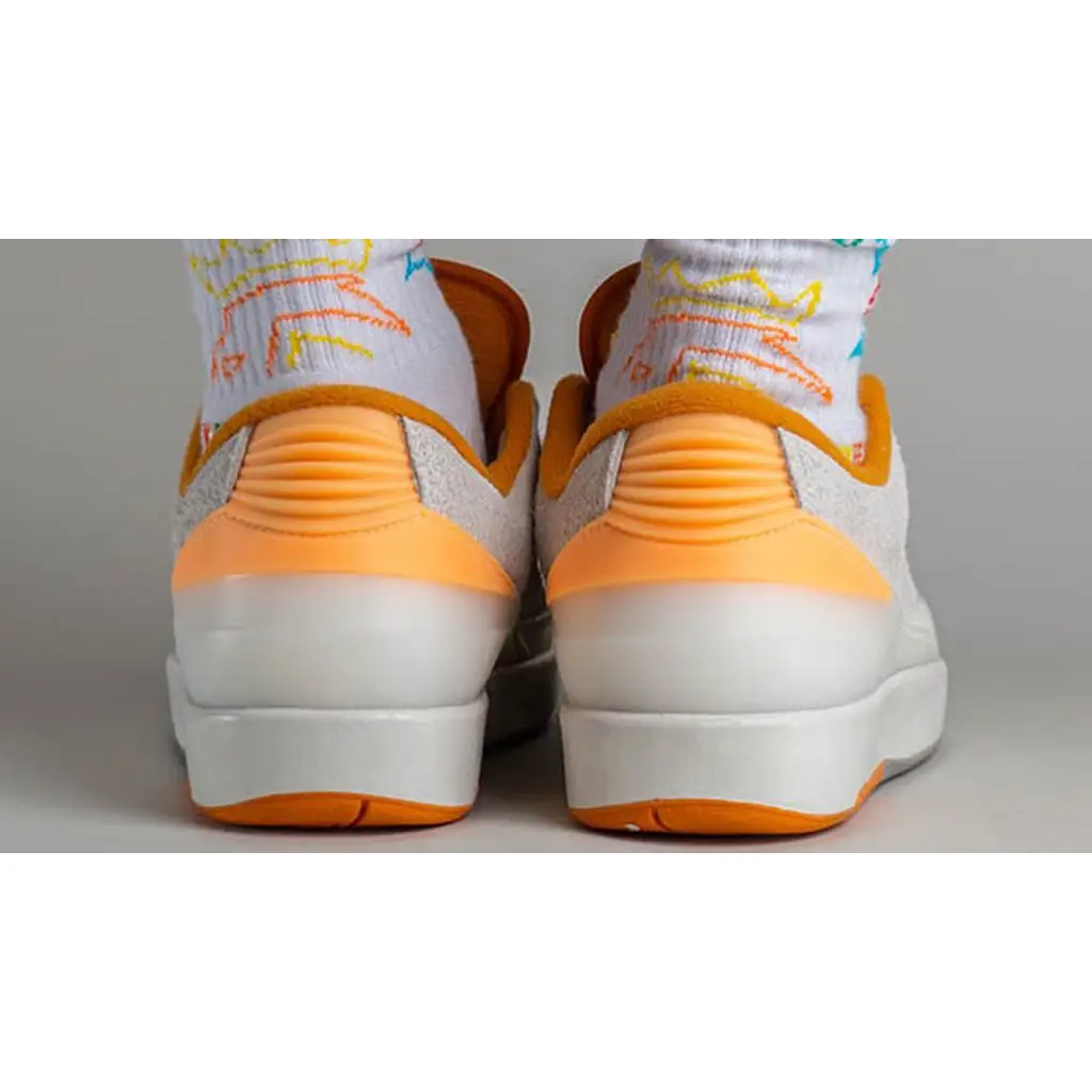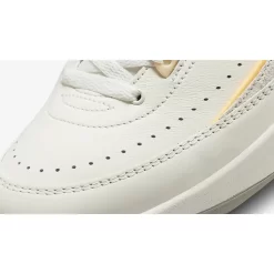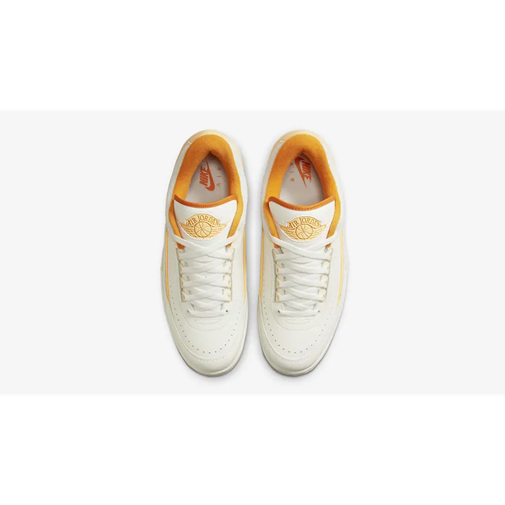 This AJ2 has a “Sail/ Light Curry/ Melon Tint/ Cobblestone” colour palette. A neutral-coloured suede foxing and white tongue contrast with a Light Curry sock liner and tongue piping. A creamy Melon Tint dresses up the TPU heel clip, Air Jordan branding on the tongue and the quarter and collar lining. A comfy all-white midsole and a rubber outsole split into Light Curry on the heel and Cobblestone at the front round out the look of this sneaker.