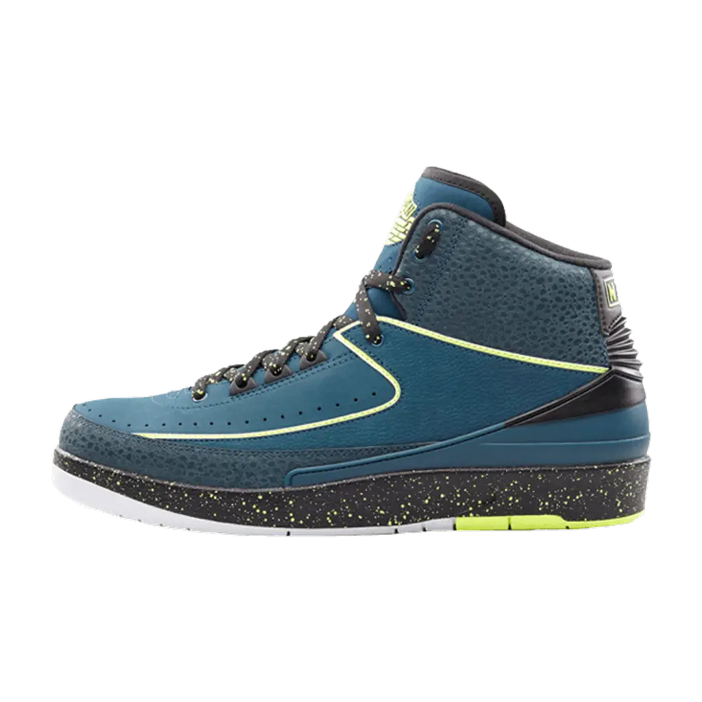 The Nike Air Jordan 2 Retro Nightshade features volt accents and speckling alongside a Nightshade green upper.